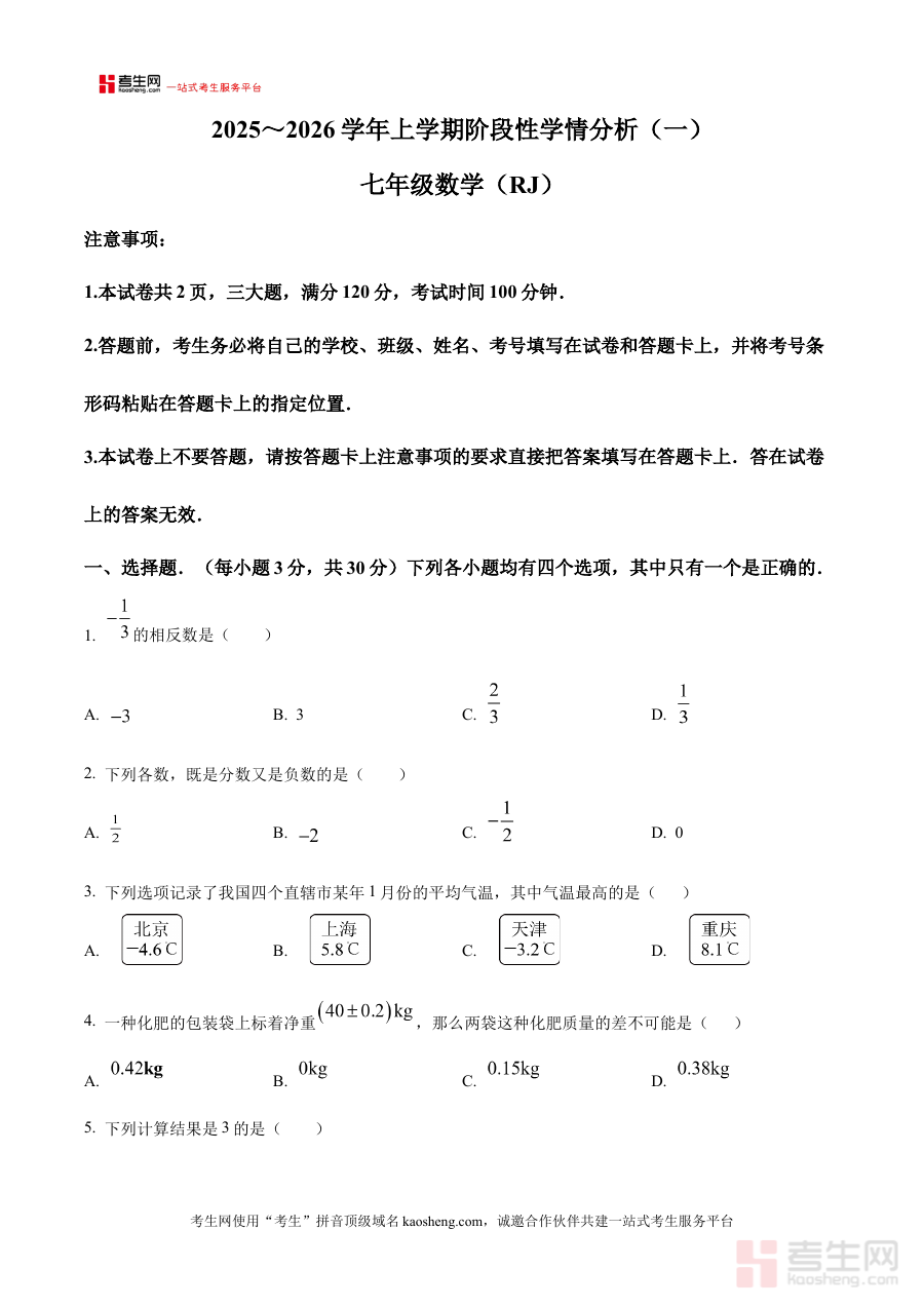 此资料的适用人群主要为陕西省西安市周至县楼观镇就峪中学2025-2026学年七年级的学生及数学教师,同时也可为区域内同年级、同阶段的其他初中师生提供参考价值。其价值体现在通过真实的月考原卷形式,实现对七年级上学期初期数学学习成果的有效检测,帮助学生制定个性化备考策略以巩固知识、提升应试能力;助力教师优化教学方案,增强教学针对性与有效性,共同推动阶段学习目标的达成,为后续数学学习奠定坚实基础。