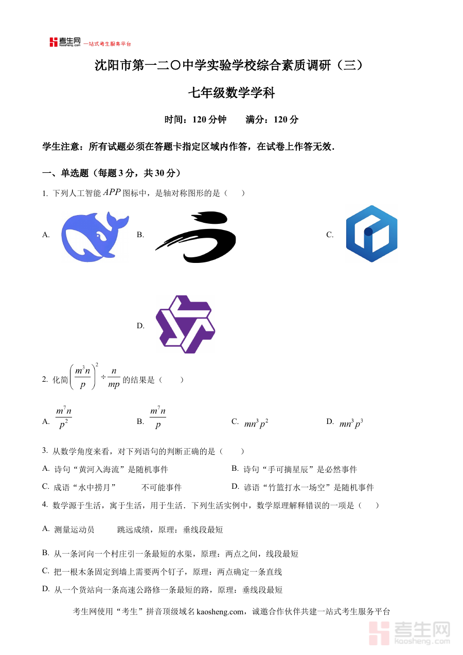 《精品解析:辽宁省沈阳市第一二0中学2024-2025学年七年级下学期数学6月月考试卷(原卷版)》是辽宁省沈阳市第一二0中学针对2024-2025学年七年级下学期数学学科6月份月度考试编制的原卷资料,属于该阶段数学学习的阶段性检测备考材料。该资料紧密贴合学校当月数学教学进度与考核标准,能够直接反映该校七年级下学期数学学科在6月份的教学重点与阶段性考核方向,为相关使用者提供与实际教学场景高度匹配的检测依据。
