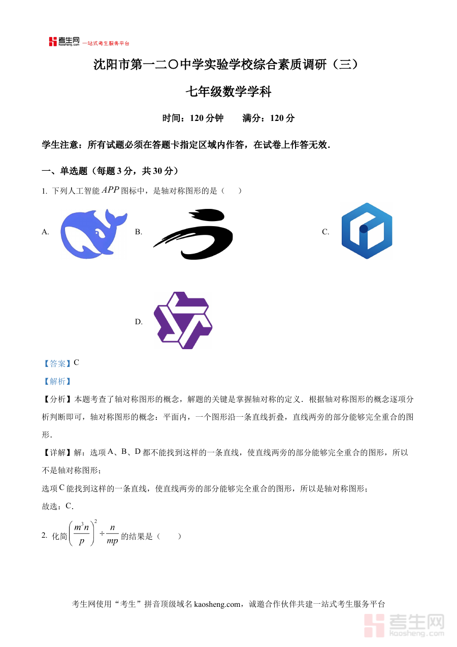《精品解析:辽宁省沈阳市第一二0中学2024-2025学年七年级下学期数学6月月考试卷(解析版)》是针对辽宁省沈阳市第一二0中学2024至2025学年七年级下学期数学学科6月月考的专项备考资料。该资料紧密贴合该校该学年学期的数学教学进度与考试要求,以当月月考的试卷为核心载体搭配详细解析内容,为学生提供精准匹配本校阶段性考试的学习资源支持,帮助学生快速对接本校的考试内容与评价标准。