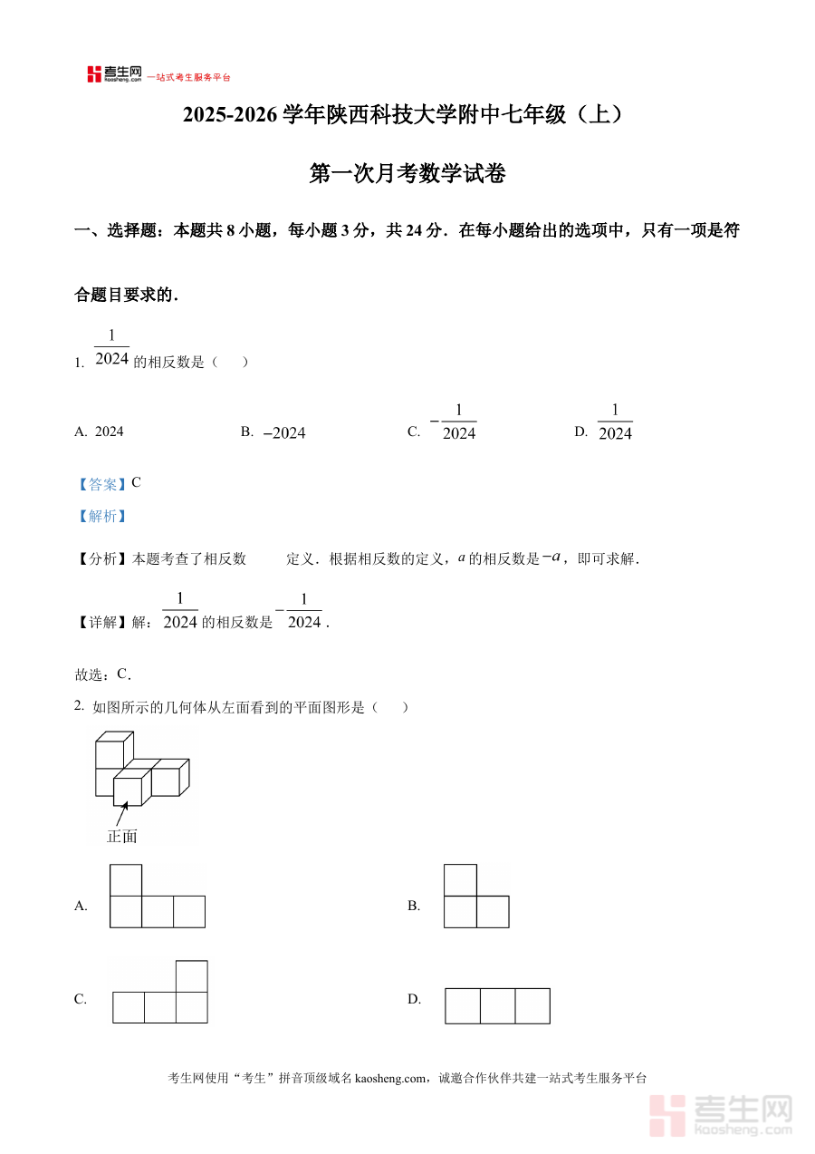 《精品解析:陕西省西安市电子科技大学附属中学2025-2026学年七年级上学期第一次月考数学试卷(解析版)》是针对陕西省西安市电子科技大学附属中学特定学年七年级学生上学期第一次月考数学科目的专项备考资料。该资料依托学校该学年七年级数学的阶段性教学进度与考试安排,聚焦七年级上学期数学学科入门阶段的学习内容,为使用者提供贴合该校教学要求与考试方向的参考依据。作为解析版资料,它不仅呈现了试卷的整体结构框架,更通过详细的解析部分帮助使用者理解考试的核心考查点与答题思路方向,是衔接七年级数学初期学习与阶段性评估的重要辅助资源。