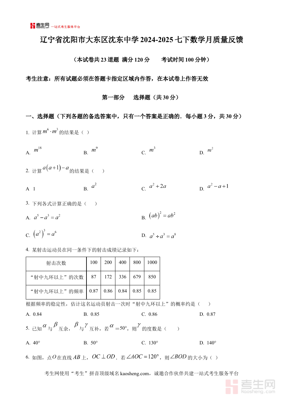 《精品解析:辽宁省沈阳市大东区沈东中学2024-2025学年七年级下学期数学月质量反馈试卷(原卷版)》是2024-2025学年辽宁省沈阳市大东区沈东中学七年级下学期数学学科月度质量反馈考试的原卷类备考资料,为使用者提供该阶段数学考试的真实试卷内容呈现,是贴合该学校该年级数学阶段性考试需求的针对性资料。