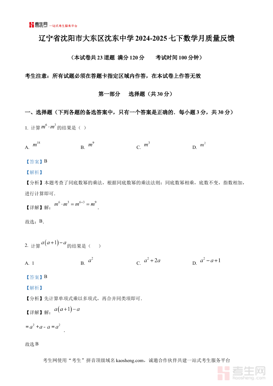 《精品解析:辽宁省沈阳市大东区沈东中学2024-2025学年七年级下学期数学月质量反馈试卷(解析版)》是针对辽宁省沈阳市大东区沈东中学2024-2025学年七年级下学期数学学科月度质量反馈考试的专项备考资料,聚焦该阶段学校数学学科的阶段性检测需求,为使用者提供与本次考试直接相关的解析内容支持。
