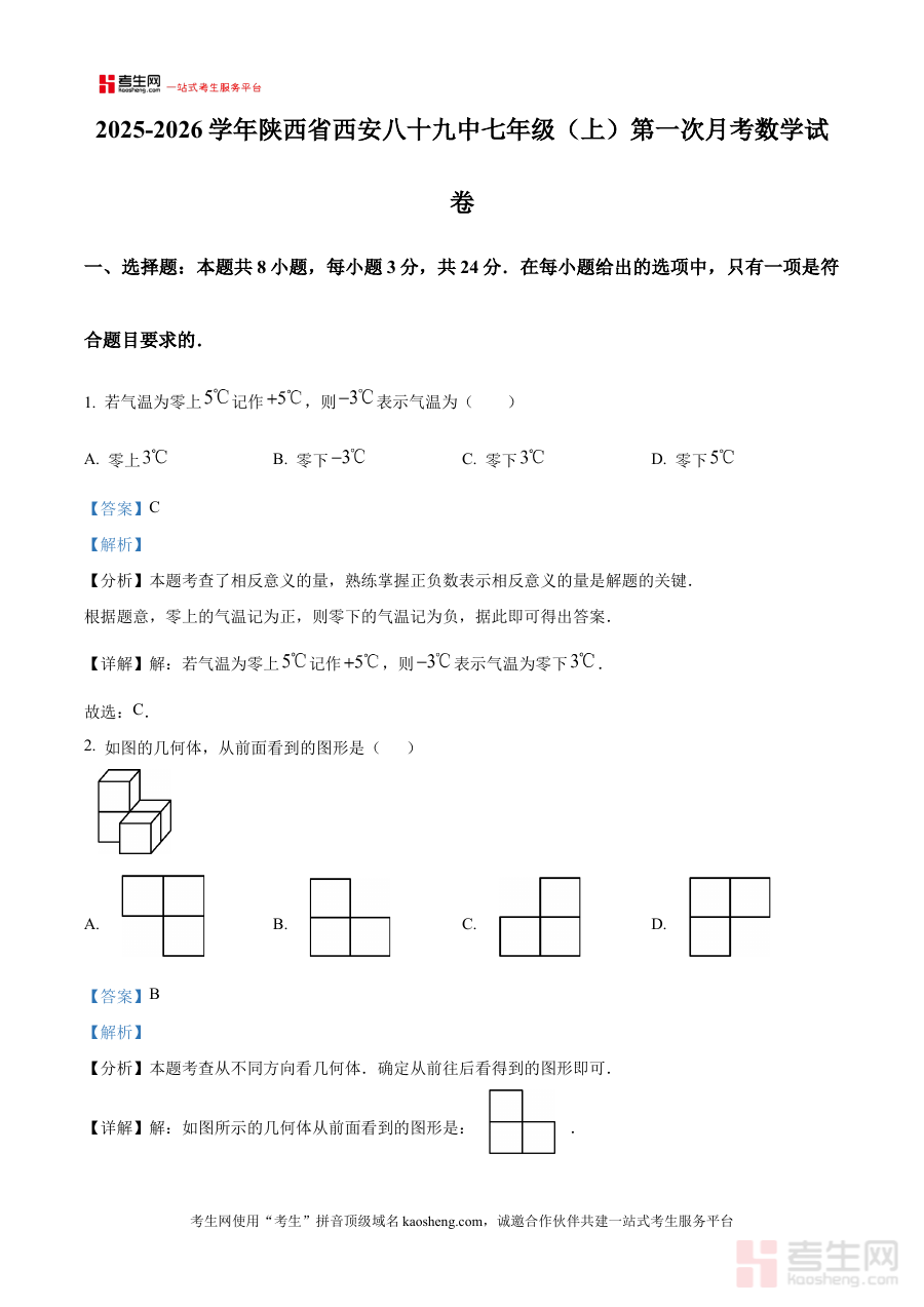 《精品解析:陕西省西安市第八十九中学2025-2026学年七年级上学期第一次月考数学试卷(解析版)》是针对陕西省西安市第八十九中学特定学年七年级上学期首次数学月考的专业备考资料,涵盖该学校该阶段数学学科月考的相关内容解析。作为解析版资料,它能够为使用者提供该次月考的系统解读,帮助其把握本校月考的考查方向与要求,是适配该学校七年级学生及教师的针对性参考材料,助力使用者快速对接本校月考的考查逻辑与内容框架。