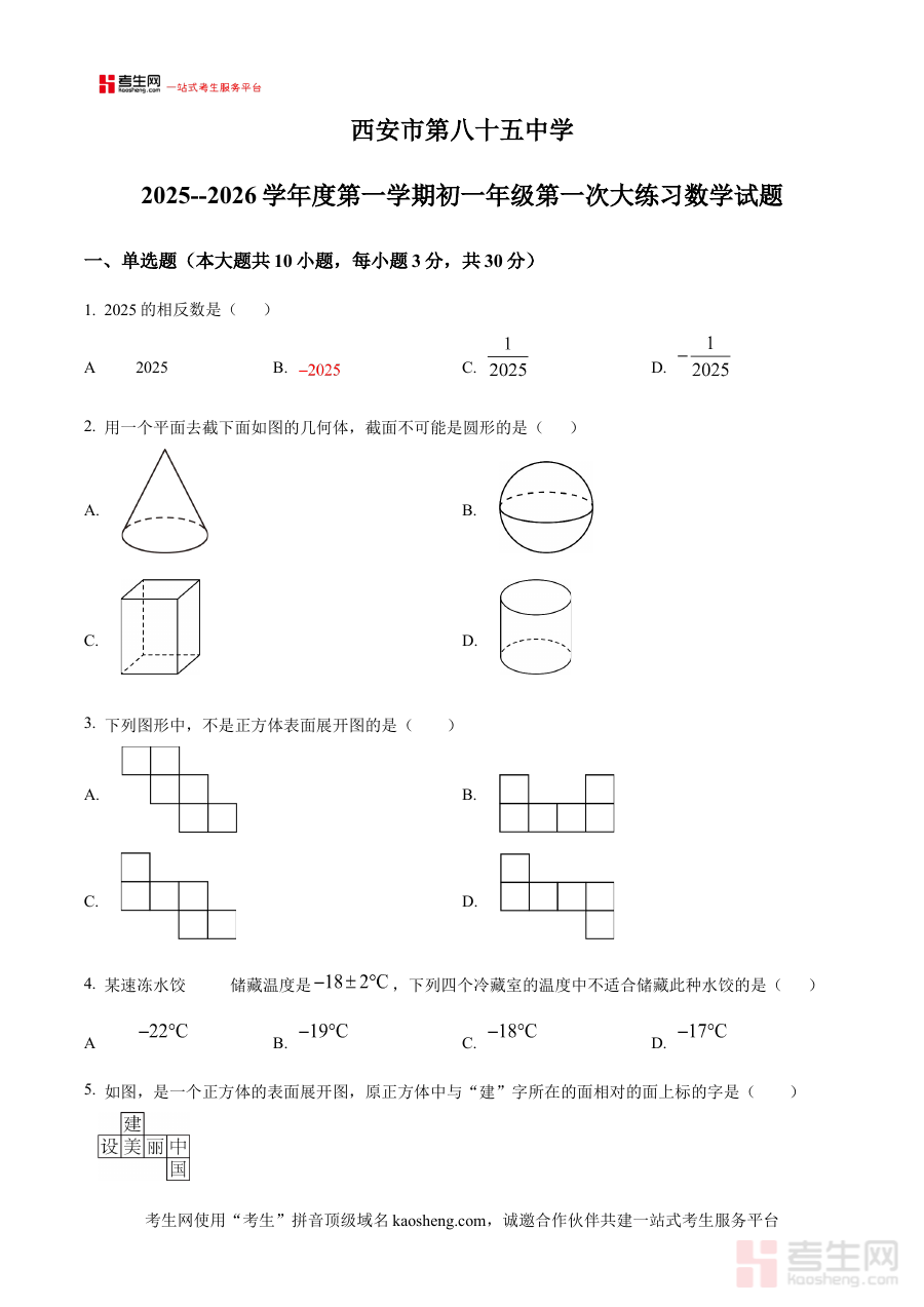 《精品解析:陕西省西安市第八十五中学2025-2026学年七年级上学期第一次月考数学试题(原卷版)》是针对陕西省西安市第八十五中学特定学年段与考试节点的数学学科备考资料,明确对应2025-2026学年七年级上学期的首次月度检测,能够完整呈现该校该次月考数学试题的原始形态,为相关使用者提供与实际考试场景高度契合的试题资源,精准反映该校在七年级数学学科初期阶段的考查重点与命题风格。