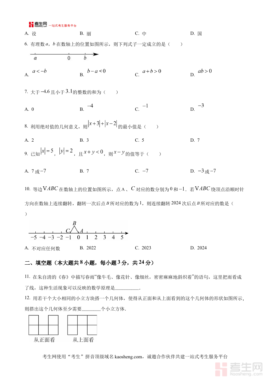该原卷版试题具有多方面的实用价值,可助力教师开展学情诊断工作,通过分析学生对试题的完成情况,全面掌握班级学生在数学学习起步阶段的知识理解程度与能力发展水平;同时,也能为学生制定科学的备考规划提供依据,让学生清晰了解首次月考的试卷结构与考查范围,从而有针对性地进行复习准备;此外,作为阶段检测的模拟载体,该试题可帮助学生提前适应考试节奏,提升应试技巧与时间管理能力。