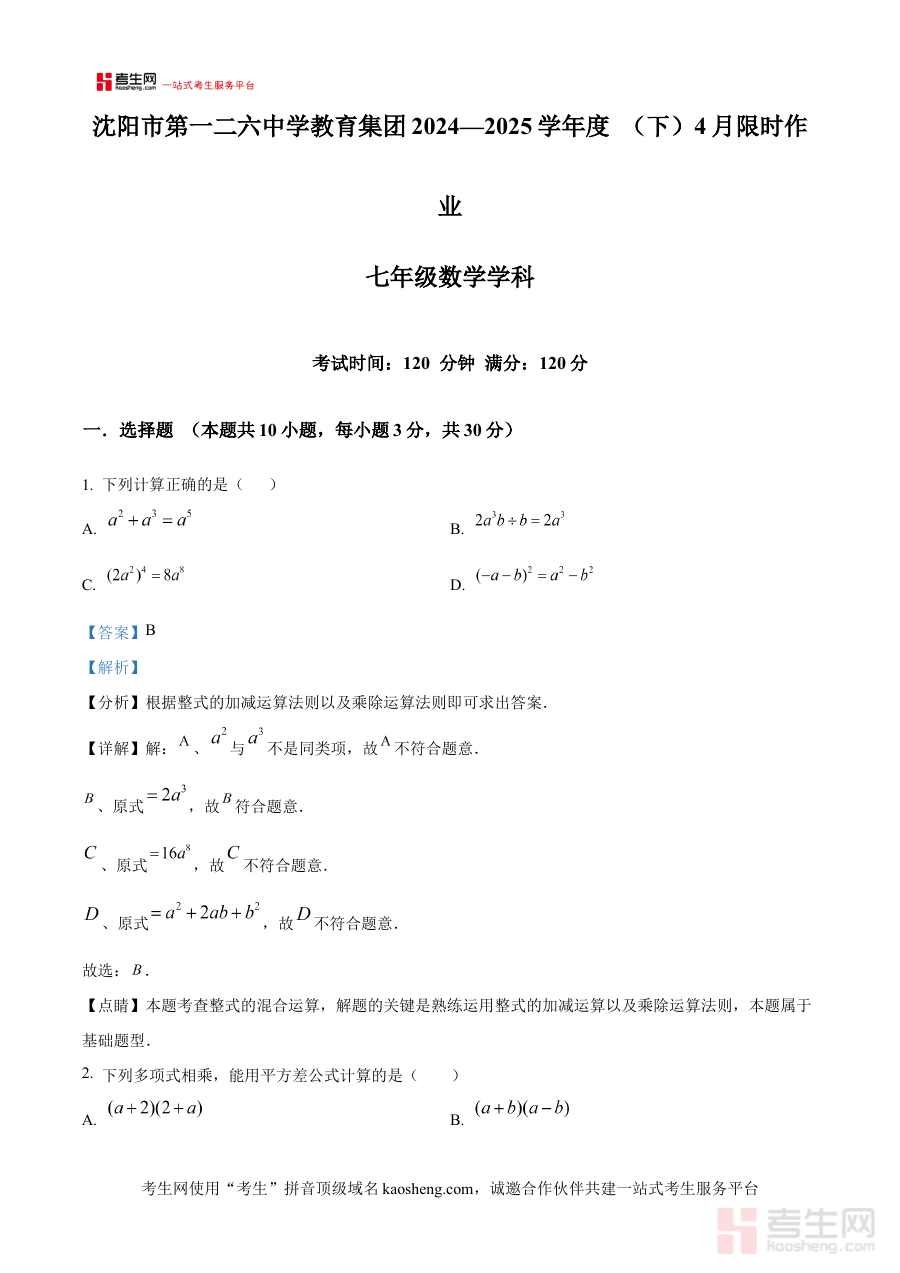 《精品解析:辽宁省沈阳市第一二六中学2024—2025学年七年级下学期4月月考数学试卷(解析版)》是针对辽宁省沈阳市第一二六中学2024至2025学年七年级下学期4月数学月考的专项备考资料。该资料依托该校当学期阶段性教学进度与考试要求编制,聚焦七年级下学期数学学科的阶段学习成果检测需求。