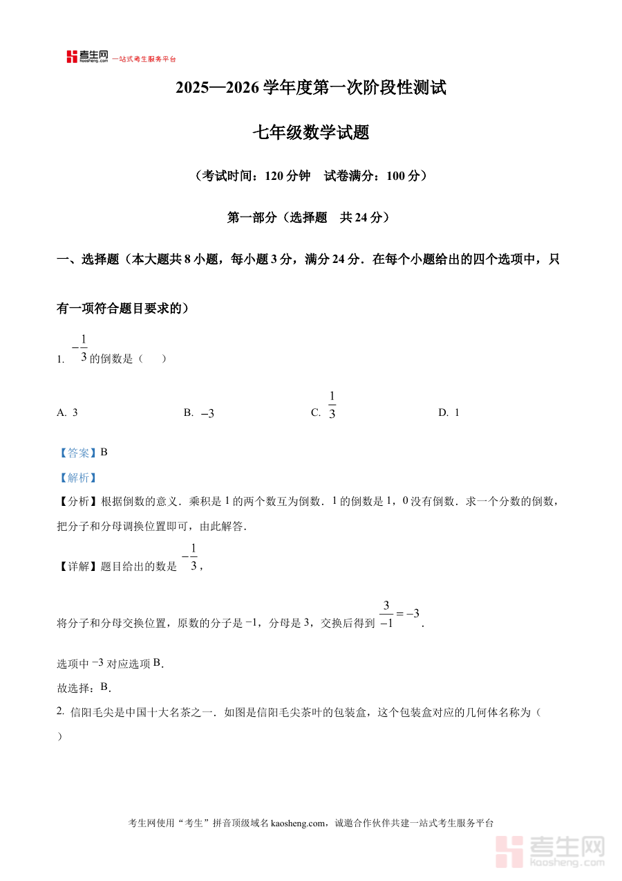 《精品解析:陕西省西安市西咸新区空港实验学校2025-2026学年七年级上学期第一次阶段性测试数学试卷(解析版)》是针对陕西省西安市西咸新区空港实验学校2025-2026学年七年级上学期第一次阶段性数学测试的专业备考资料。该资料紧扣七年级上学期初期数学学习阶段特点及学校阶段性测试的考查需求,为学生、教师及家长提供了针对性的解析支持,既贴合该学校的教学进度与测试方向,也能满足同类阶段学习群体的参考需求。