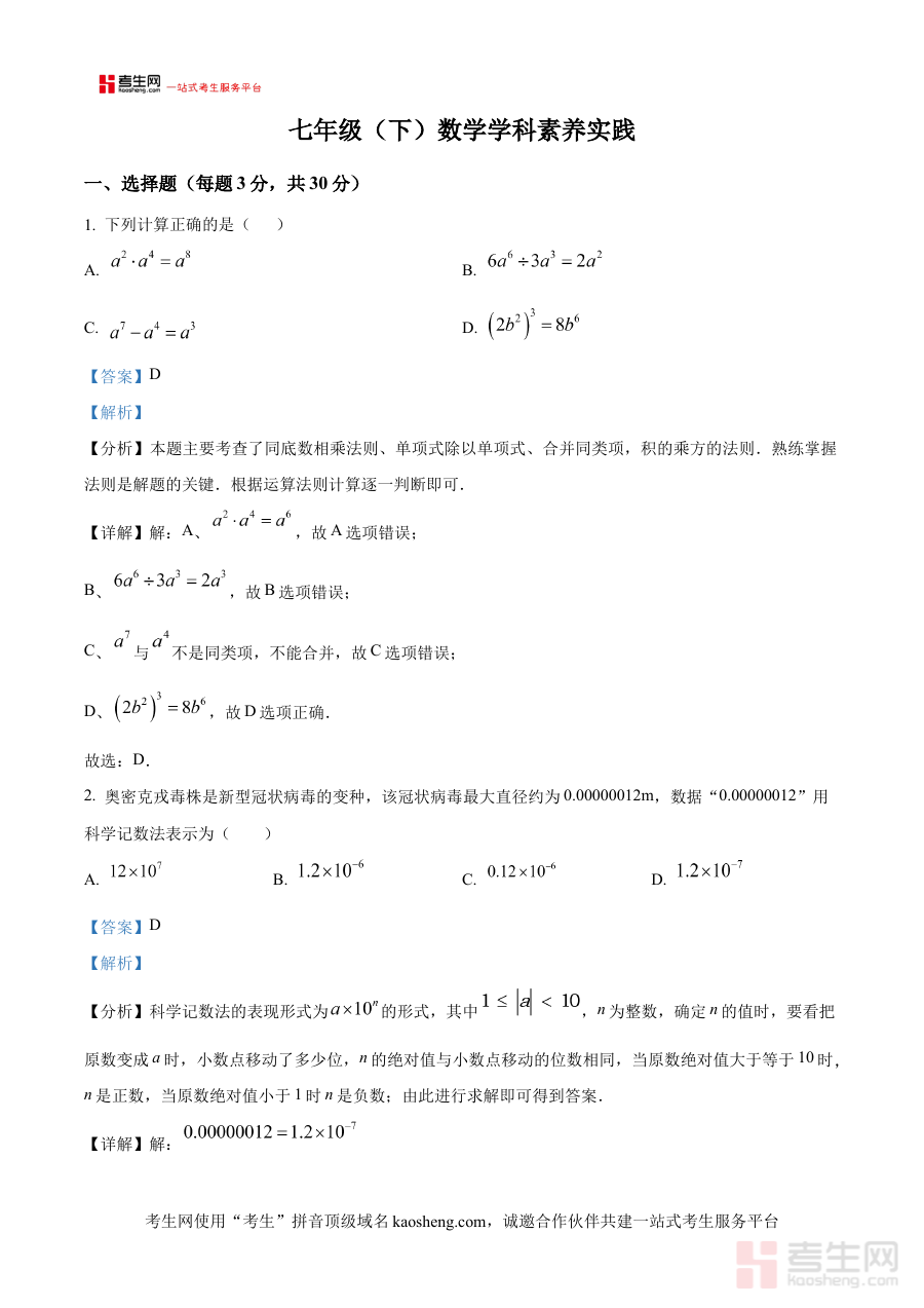 该资料可帮助使用者准确把握七年级下学期4月阶段数学考试的考查方向与评价重点,通过解析内容实现对阶段性学习成果的有效诊断,为后续学习规划与备考策略调整提供数据支撑和方向指引。