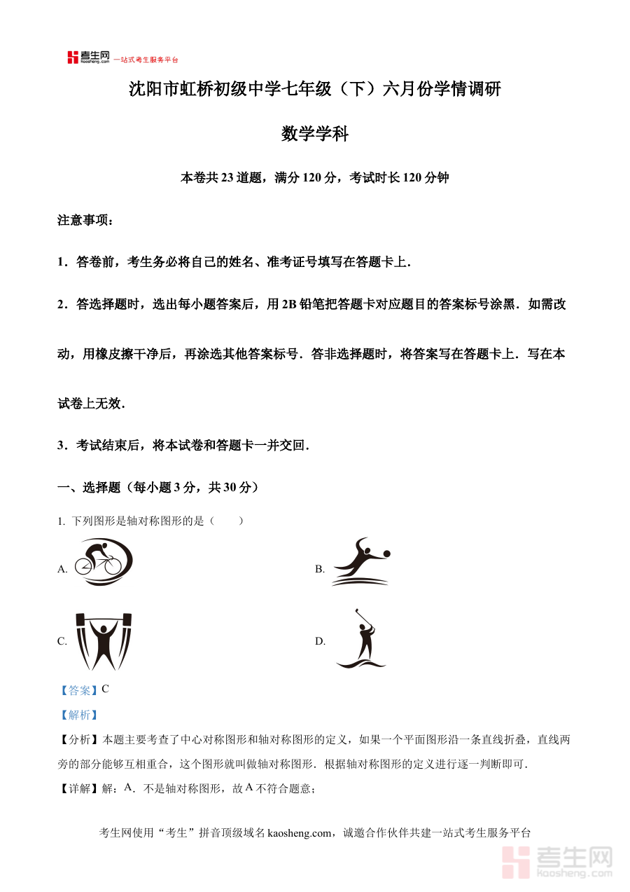 《精品解析:辽宁省沈阳市虹桥中学教育集团2024-2025学年下学期七年级6月月考数学试题(解析版)》是针对辽宁省沈阳市虹桥中学教育集团2024-2025学年下学期七年级6月月考数学科目的专业备考资料,聚焦该阶段月度学业检测场景,为相关师生提供精准的考试内容解析支持。