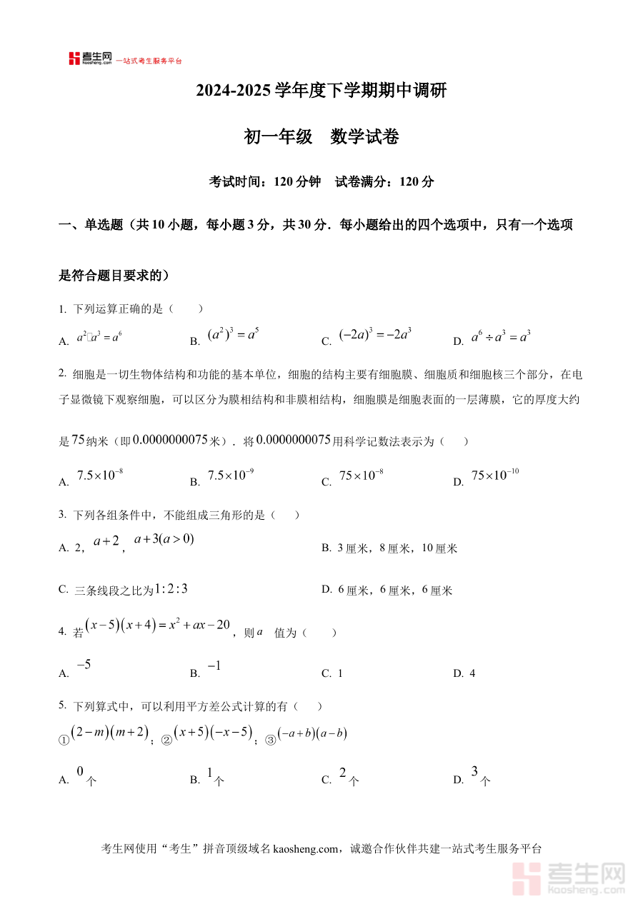 《精品解析:辽宁省沈阳市东北育才学校(初中部)2024-2025学年七年级下学期期中数学试题(原卷版)》是针对辽宁省沈阳市东北育才学校初中部2024至2025学年七年级下学期期中数学考试的备考资料,精准匹配该阶段考试的时间节点与地区学校属性,为相关学习者提供贴合实际考试场景的练习载体。