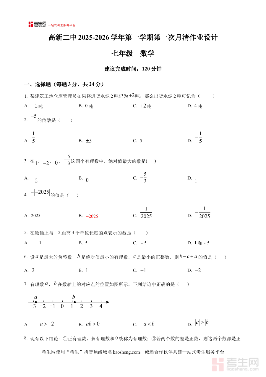 《精品解析:陕西省西安市高新第二初级中学2025-2026学年七年级上学期第一次月考数学试题(原卷版)》是针对陕西省西安市高新第二初级中学特定学年与学段的数学学科阶段性考试资料。它精准对应2025-2026学年七年级上学期的首次月考场景,明确了地域归属为西安市高新第二初级中学,考试类型为七年级上学期第一次月考数学科目,作为原卷版资料,为相关使用者提供了与该校实际考试形式一致的备考素材支撑。