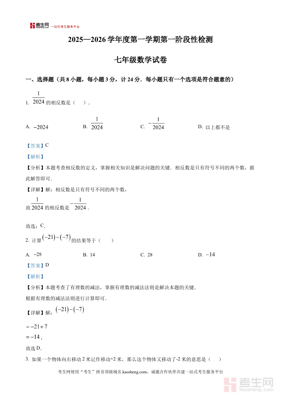 《精品解析:陕西省西安市高陵区昭慧中学2025-2026学年七年级上学期10月月考数学试题(解析版)》是针对陕西省西安市高陵区昭慧中学特定学年及学期的数学阶段性考试资料。该资料对应2025-2026学年七年级上学期10月的月考场景,聚焦初中数学学科的阶段学习成果检测需求,为相关师生提供了具有明确地域和校域针对性的备考辅助资源。它依托该校当月月考的数学试题展开解析,能够精准匹配该校七年级学生的学习进度与考试要求,帮助师生快速把握本次月考的考查重点与方向。