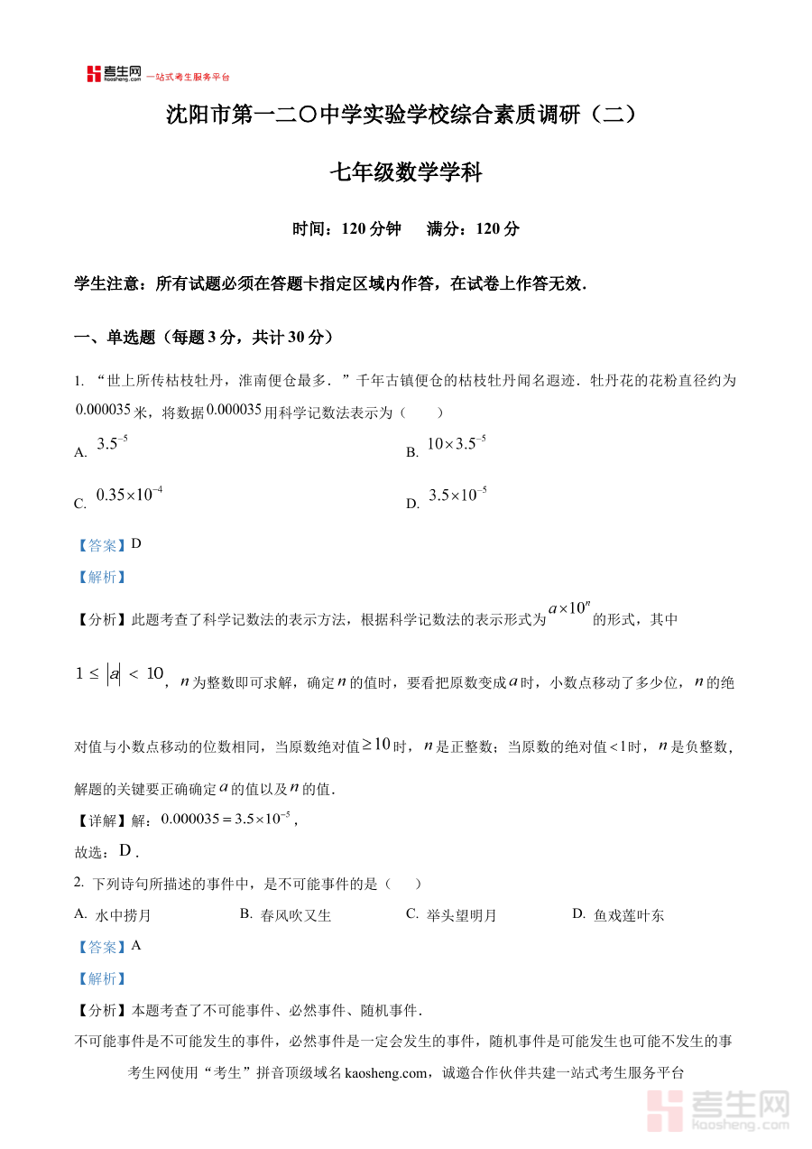 该资料适用于辽宁省沈阳市第一二O中学实验学校2024-2025学年下学期的七年级学生及相关数学教师,其解析内容可辅助阶段检测结果的深度分析,为师生制定科学合理的备考策略提供参考,强化数学学习与教学的针对性和效率。