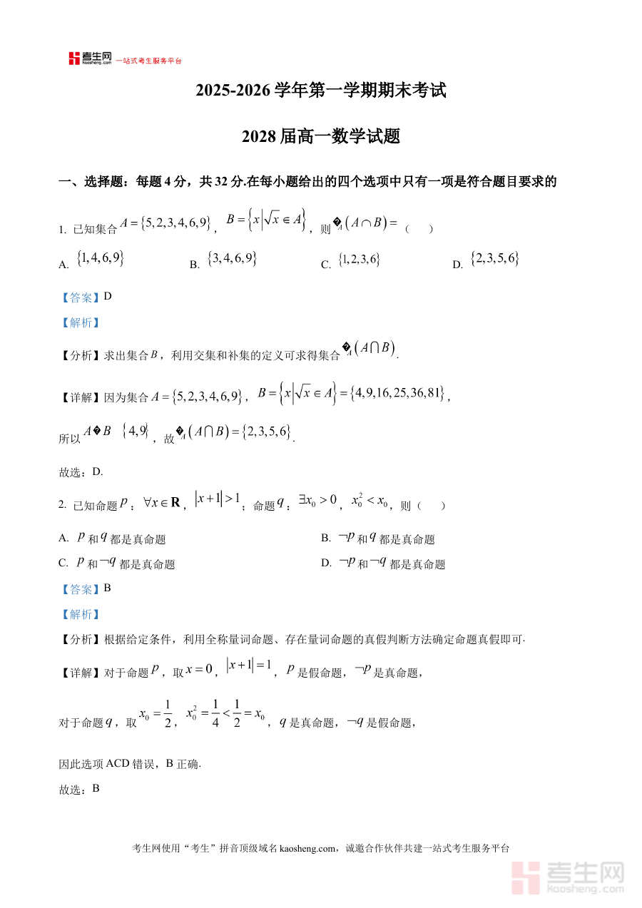 《精品解析:陕西省西安市高新第一中学2025-2026学年高一第一学期期末考试数学试题(解析版)》是针对陕西省西安市高新第一中学2025至2026学年高一学生第一学期期末考试设计的数学学科备考资料。该资料紧密贴合该校高一上学期数学教学进度与期末考试要求,为学生提供了与实际考试场景高度匹配的练习载体及配套解析内容。作为解析版资料,它不仅呈现试题本身,更通过系统的解答过程帮助使用者梳理考点关联与解题逻辑,是学生应对本次期末考试的重要辅助工具。