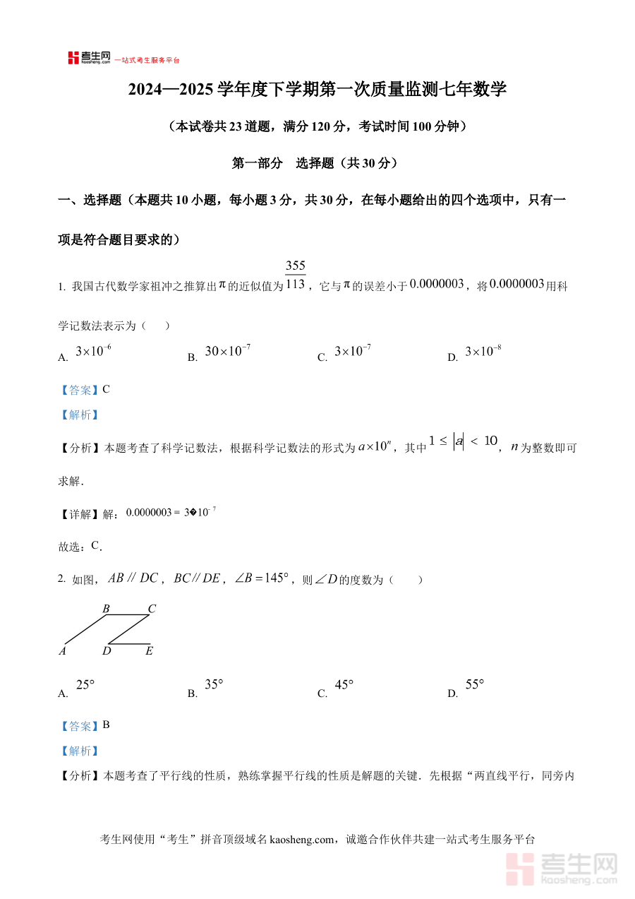 本资料适用于辽宁省沈阳市铁西区2024—2025学年下学期的七年级学生、数学教师及学生家长,能够有效支持阶段检测后的分析总结与备考规划,帮助使用者提升期中复习效率与针对性,为取得理想成绩提供有力参考。