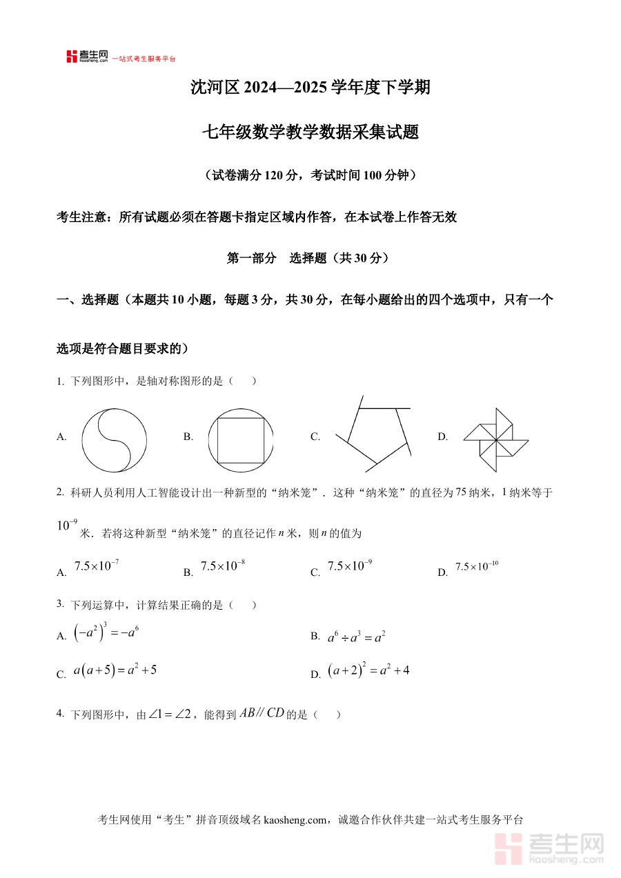 《精品解析:辽宁省沈阳市沈河区2024-2025学年七年级下学期教学数据采集数学试卷(原卷版)》是针对辽宁省沈阳市沈河区2024-2025学年七年级下学期教学数据采集考试的数学学科配套资料,精准匹配该区域该学年七年级下学期的数学教学数据采集场景,为相关备考与教学活动提供原卷形式的资源支撑。