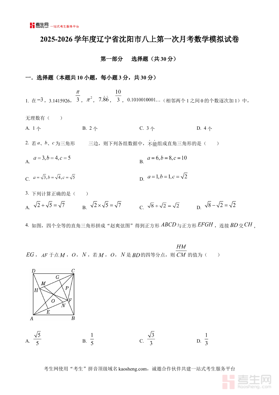 《精品解析:辽宁省沈阳市2025-2026学年八年级上学期第一次月考数学模拟试卷(原卷版)》是针对辽宁省沈阳市特定学年段与考试节点的数学备考资料,聚焦八年级上学期第一次月考这一关键阶段检测场景,贴合当地教学大纲与考试命题方向,为学生提供了符合区域学情与考试要求的练习资源,助力学生提前熟悉月考的考查框架与实施节奏。