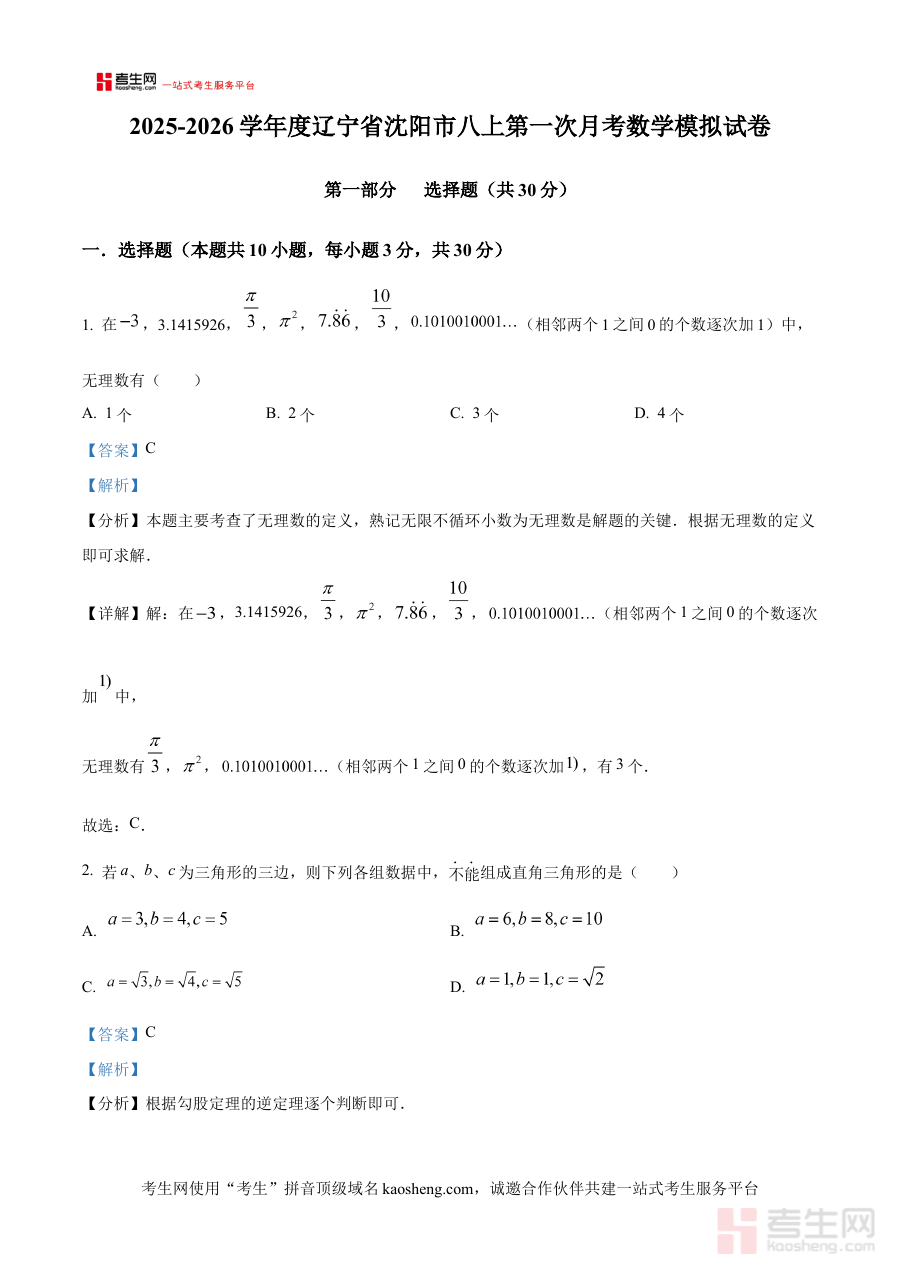 《精品解析:辽宁省沈阳市2025-2026学年八年级上学期第一次月考数学模拟试卷 (解析版)》是针对辽宁省沈阳市特定学年八年级学生上学期第一次数学月考设计的备考资料。该资料结合当地教学进度与月考考查特点编制,为学生提供贴合本地学情的模拟训练素材及配套解析内容,是阶段性数学学习检测与备考的重要参考工具。