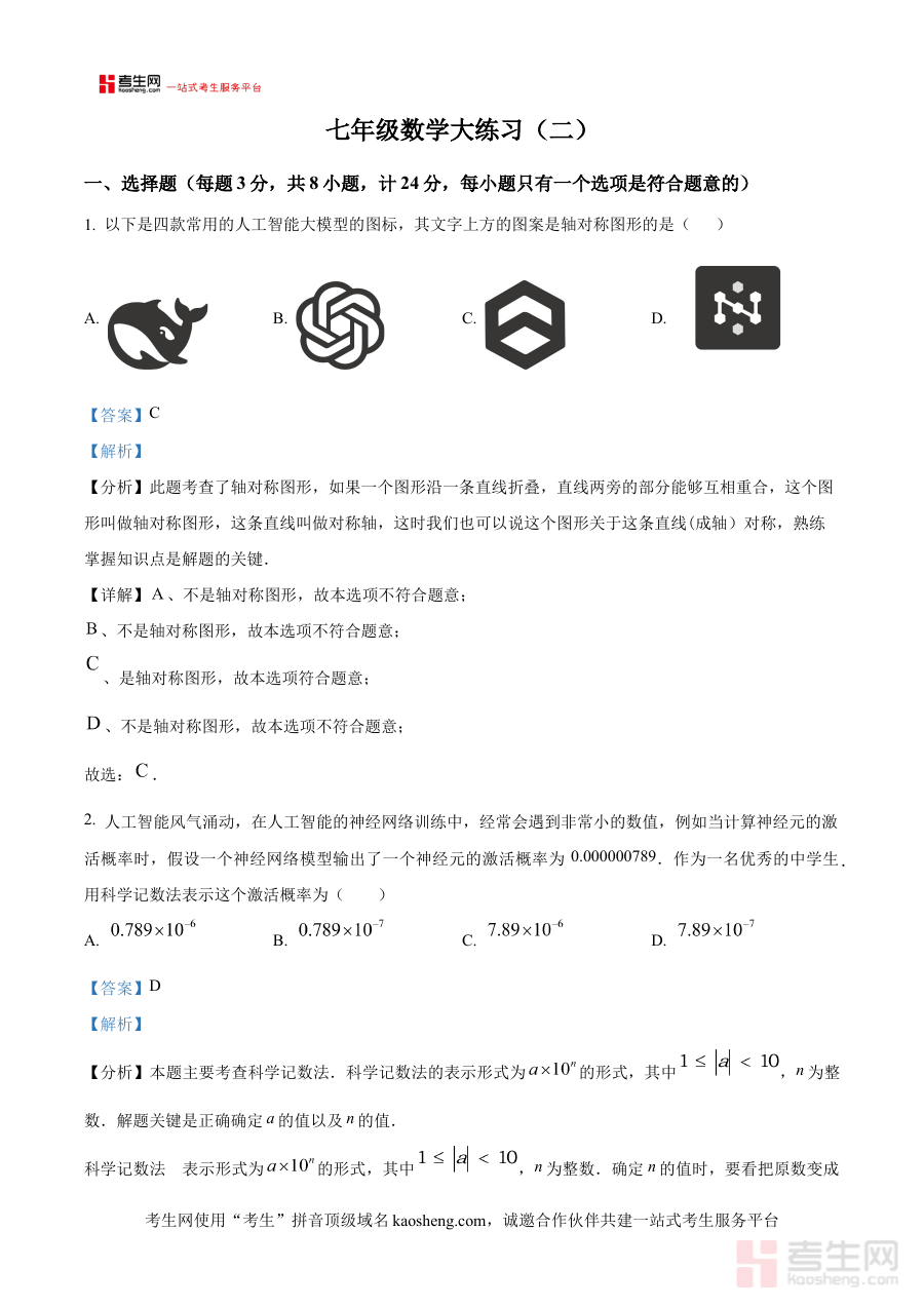 《精品解析:陕西省西安市工业大学附属中学2024-2025学年下学期第二次月考七年级数学试题(解析版)》是针对陕西省西安市工业大学附属中学2024-2025学年下学期七年级数学第二次月考的专项备考资料。该资料紧密贴合该校特定学年下学期的阶段性考试安排,聚焦七年级数学学科的中期学习内容,为使用者提供与该校月考考查方向、试题结构高度适配的解析支持,助力使用者精准掌握考试要求与知识重点,为阶段备考奠定坚实基础。