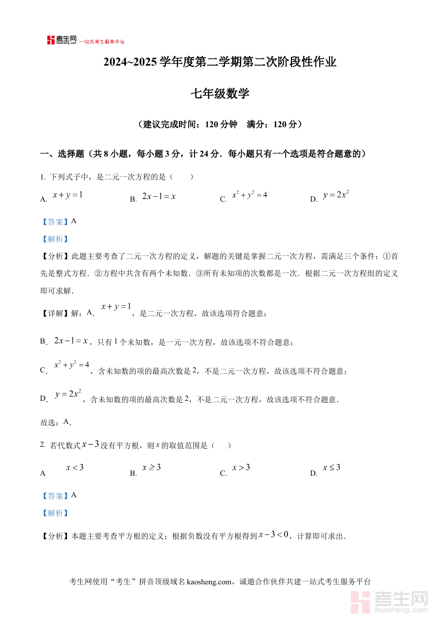 《精品解析:陕西省西安市新城区睿知教育培训中心2024-2025学年七年级下学期6月月考数学试题(解析版)》是针对陕西省西安市新城区睿知教育培训中心特定学年学期的数学月考资源。该资料聚焦2024-2025学年七年级下学期6月的月考场景,结合当地教育机构的教学实际与阶段性学习要求,为相关学习者提供了具有针对性的考试解析内容,是适配该阶段数学学习进度与考试需求的专业备考资料。