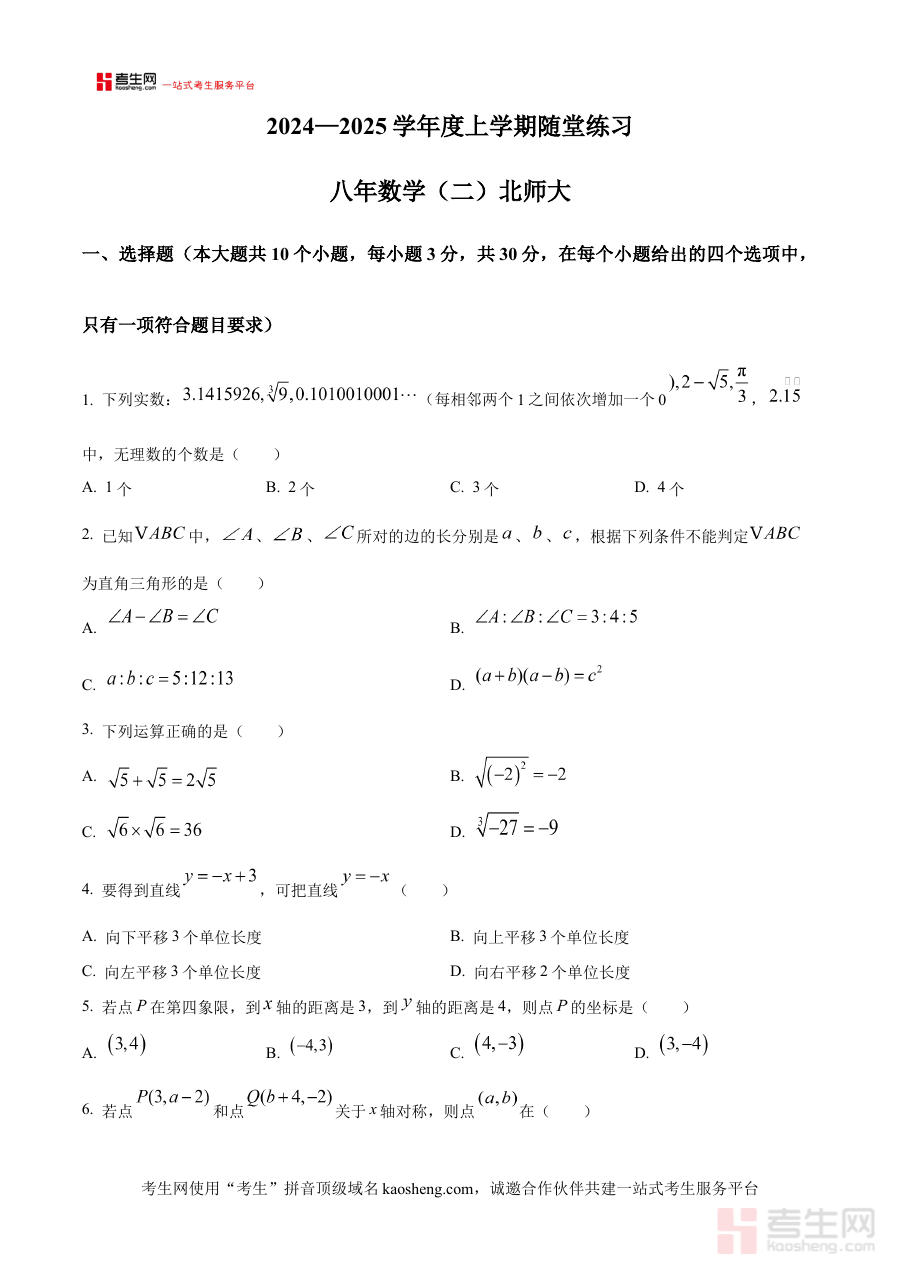 《精品解析:辽宁省沈阳市康平县2024-2025学年八年级上学期随堂练习数学试卷(二)(原卷版)》是面向辽宁省沈阳市康平县区域内2024至2025学年八年级上学期学生的数学学科随堂练习资料,属于该学年上学期数学学习过程中的阶段性检测类素材,紧密贴合当地教学进度与课程要求,为学生提供了与课堂学习同步的练习载体。