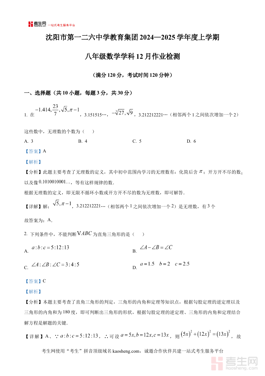 《精品解析:辽宁省沈阳市第一二六中学教育集团2024-2025学年上学期12月作业检测八年级数学试题(解析版)》是针对辽宁省沈阳市第一二六中学教育集团在2024至2025学年上学期12月开展的八年级数学作业检测所编制的解析类备考资料,精准匹配该阶段的教学进度与检测需求,为学生和教师提供了与实际检测直接相关的参考内容,助力使用者更好地把握该次作业检测的核心方向与要求。