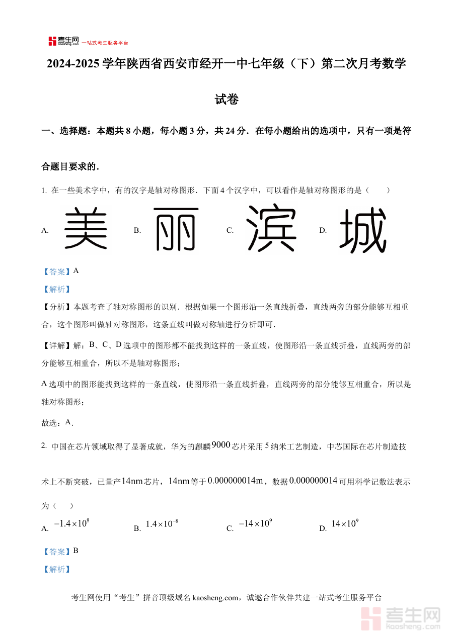 《精品解析:陕西省西安市经开第一中学2024-2025学年七年级下学期第二次月考数学试卷(解析版)》是针对陕西省西安市经开第一中学特定学年学期的数学阶段性考试配套资料,聚焦2024-2025学年七年级下学期第二次月考这一具体考试场景,精准贴合该校教学进度与考试要求,为使用者提供专业的解析支持,是该阶段数学学习的针对性备考资源。
