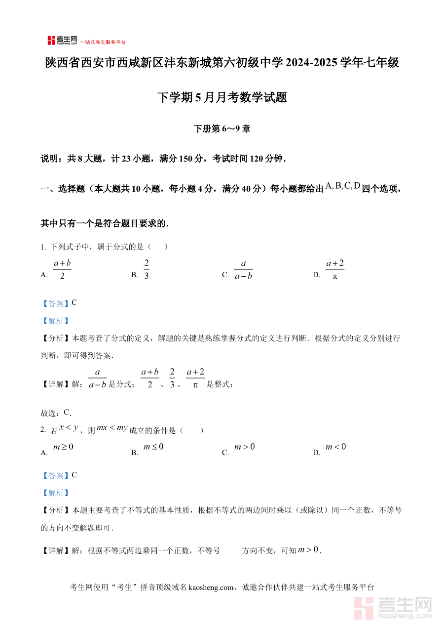 《精品解析:陕西省西安市西咸新区沣东新城第六初级中学2024-2025学年七年级下学期5月月考数学试题(解析版)》是针对陕西省西安市西咸新区沣东新城第六初级中学特定学年学期的数学阶段性考试所编制的配套解析类备考资料。该资料对应2024-2025学年七年级下学期5月的月考场景,聚焦该阶段数学学习的阶段性考查需求,能够为相关使用者提供与此次考试直接相关的专业解析支持,帮助使用者精准把握考试的整体框架和核心考查方向,为后续的复习与备考奠定基础。