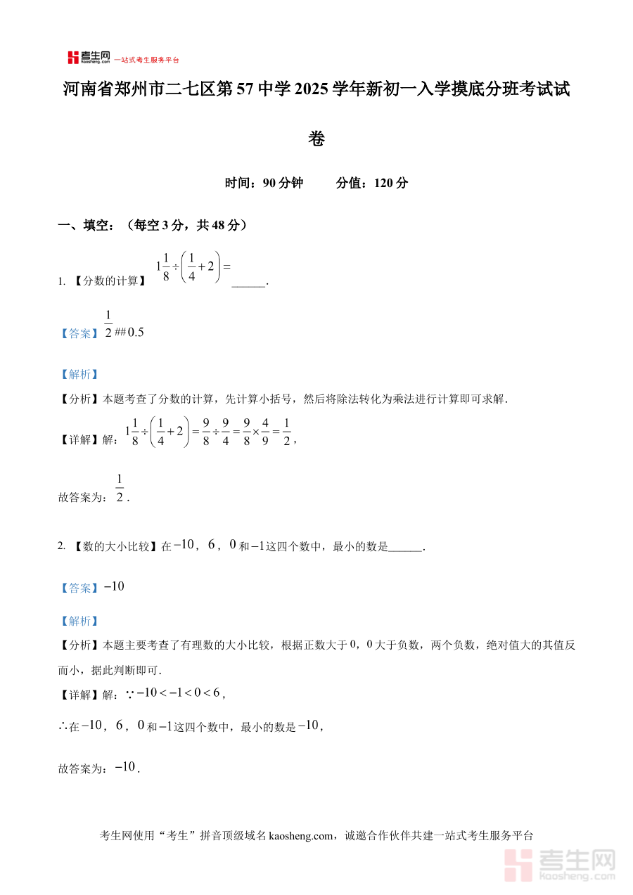 《精品解析:河南省郑州市第五十七中学2025年新七年级数学入学摸底分班考试试卷(解析版)》是针对2025年河南省郑州市第五十七中学新七年级数学入学摸底分班考试设计的专业备考资料。该资料聚焦特定地区与学校的入学考试需求,结合目标考试的性质与定位,为使用者提供精准的复习辅助支持。