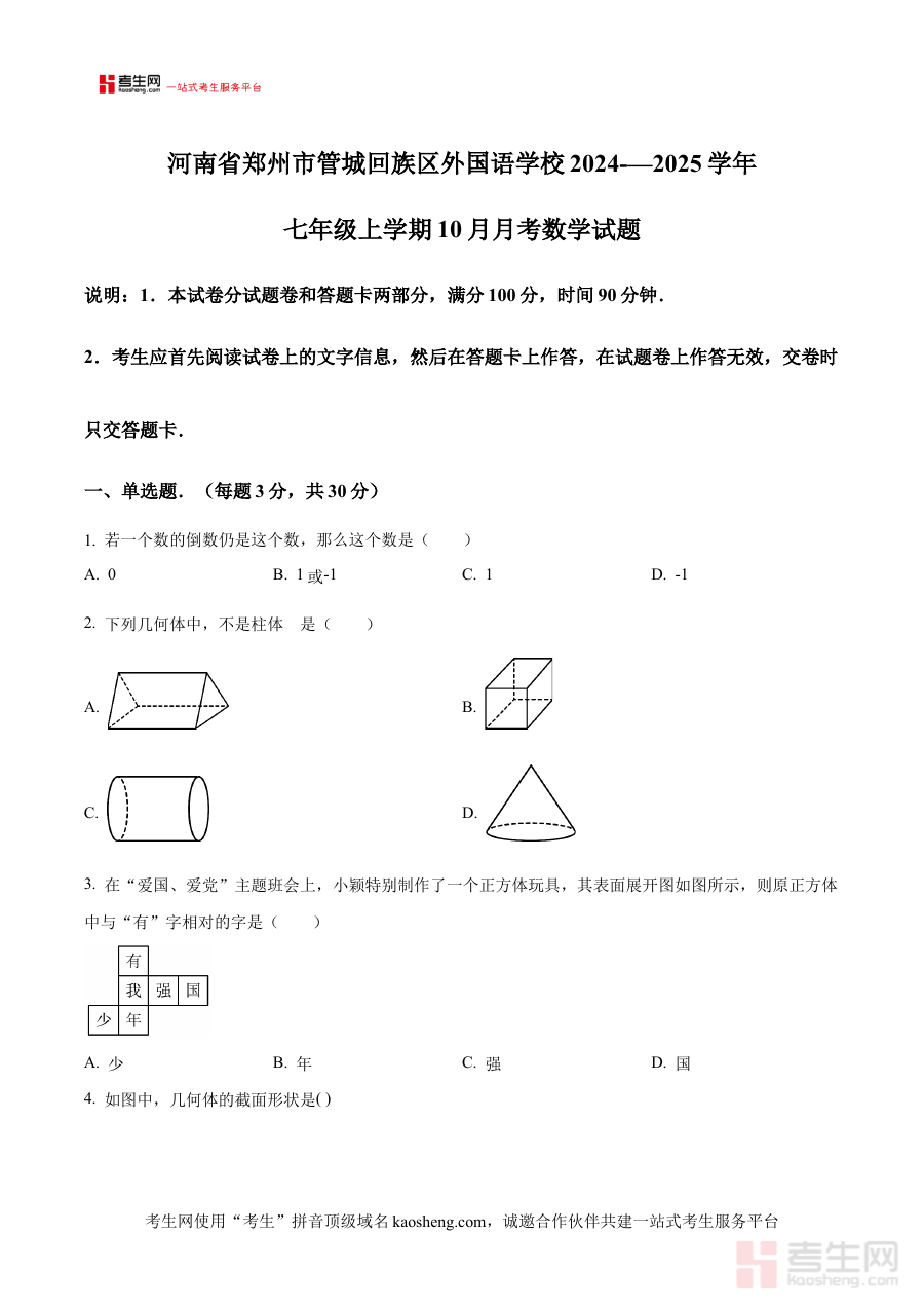 《精品解析:河南省郑州市管城回族区外国语学校2024—2025学年七年级上学期10月月考数学试题(原卷版)》是针对河南省郑州市管城回族区外国语学校2024至2025学年七年级上学期10月数学月考的配套备考资料,聚焦该阶段学校数学学科的阶段性考试需求,为相关师生提供贴合校情的考试内容参考。
