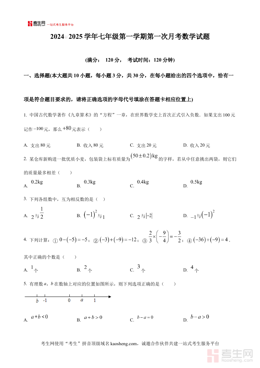 《精品解析:河南省郑州市郑州外国语中学2024-2025学年七年级上学期第一次月考数学试题(原卷版)》是针对河南省郑州市郑州外国语中学2024-2025学年七年级上学期第一次月考数学科目的备考资料,聚焦该阶段数学学科的阶段性检测需求,为使用者提供与考试直接相关的原卷内容参考。