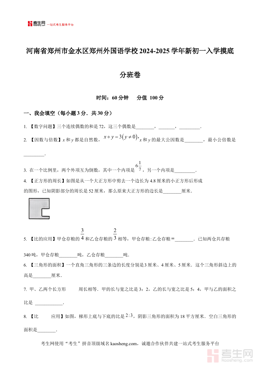 此资料的适用人群为即将就读河南省郑州市金水区郑州外国语学校七年级的新生。通过使用这份原卷进行模拟练习,学生能够提前熟悉入学摸底考试的结构与要求,精准定位自身学习中的优势与不足,进而开展有针对性的考前复习与知识巩固工作,为顺利通过分班考试、进入合适班级及高效开启初中数学学习筑牢基础。