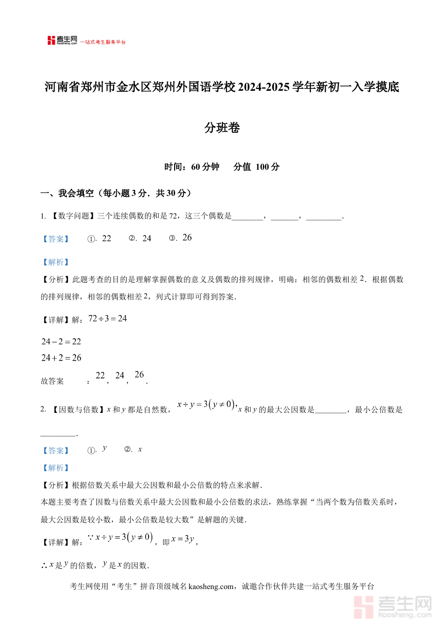 《精品解析:河南省郑州市金水区郑州外国语学校2024-2025学年七年级入学摸底分班考试数学卷(解析版)》是针对2024-2025学年河南省郑州市金水区郑州外国语学校七年级新生入学摸底分班考试数学科目的专业备考资料。该资料聚焦该校特定的入学考试场景,结合当学年小学与初中数学衔接的需求,为考生提供具有针对性的解析内容,帮助考生提前熟悉考试形式与考查方向,是适配该校入学考试的重要参考材料。