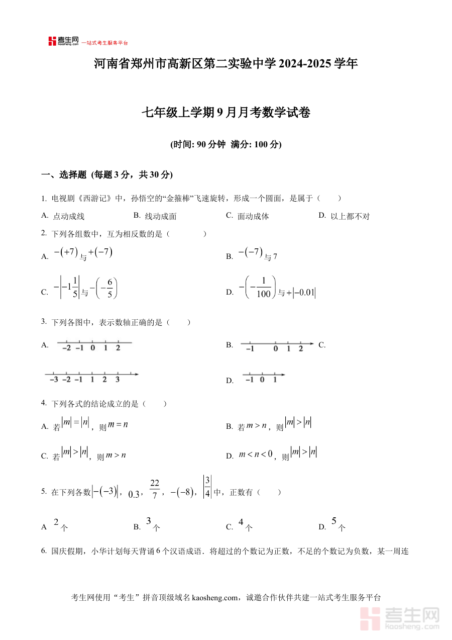 《精品解析:河南省郑州市高新区第二实验中学2024-2025学年七年级上学期9月月考数学试卷(原卷版)》是针对河南省郑州市高新区第二实验中学2024-2025学年七年级上学期9月数学月考设计的专属备考资料,紧密贴合该校该阶段数学学科的阶段性检测特点,为学生提供与本校考试实际高度匹配的练习资源。