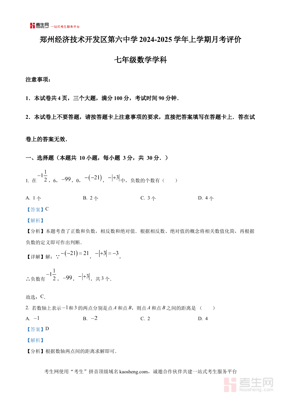 《精品解析:河南省郑州经济技术开发区第六中学2024-2025学年上学期月考评价七年级数学试卷(解析版)》是针对河南省郑州经济技术开发区第六中学2024至2025学年上学期七年级数学月考评价的专业备考资料,结合该阶段数学学习进度与该校教学实际,为相关人员提供具有针对性的试题解析内容。