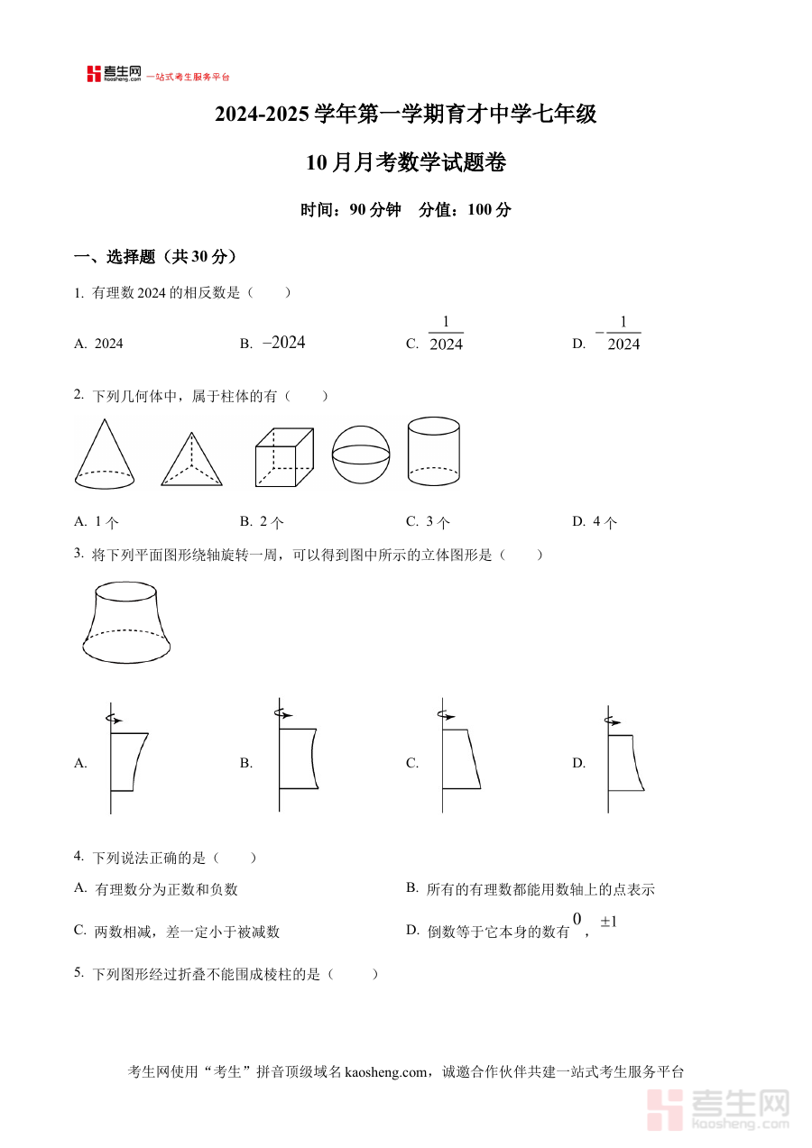 《精品解析:河南省郑州经济技术开发区育才中学2024—2025学年上学期10月月考七年级数学试卷(原卷版)》是针对河南省郑州经济技术开发区育才中学2024至2025学年第一学期七年级数学学科10月月考的专用备考资料,精准匹配该学校该阶段数学教学的阶段性考查目标与方向。