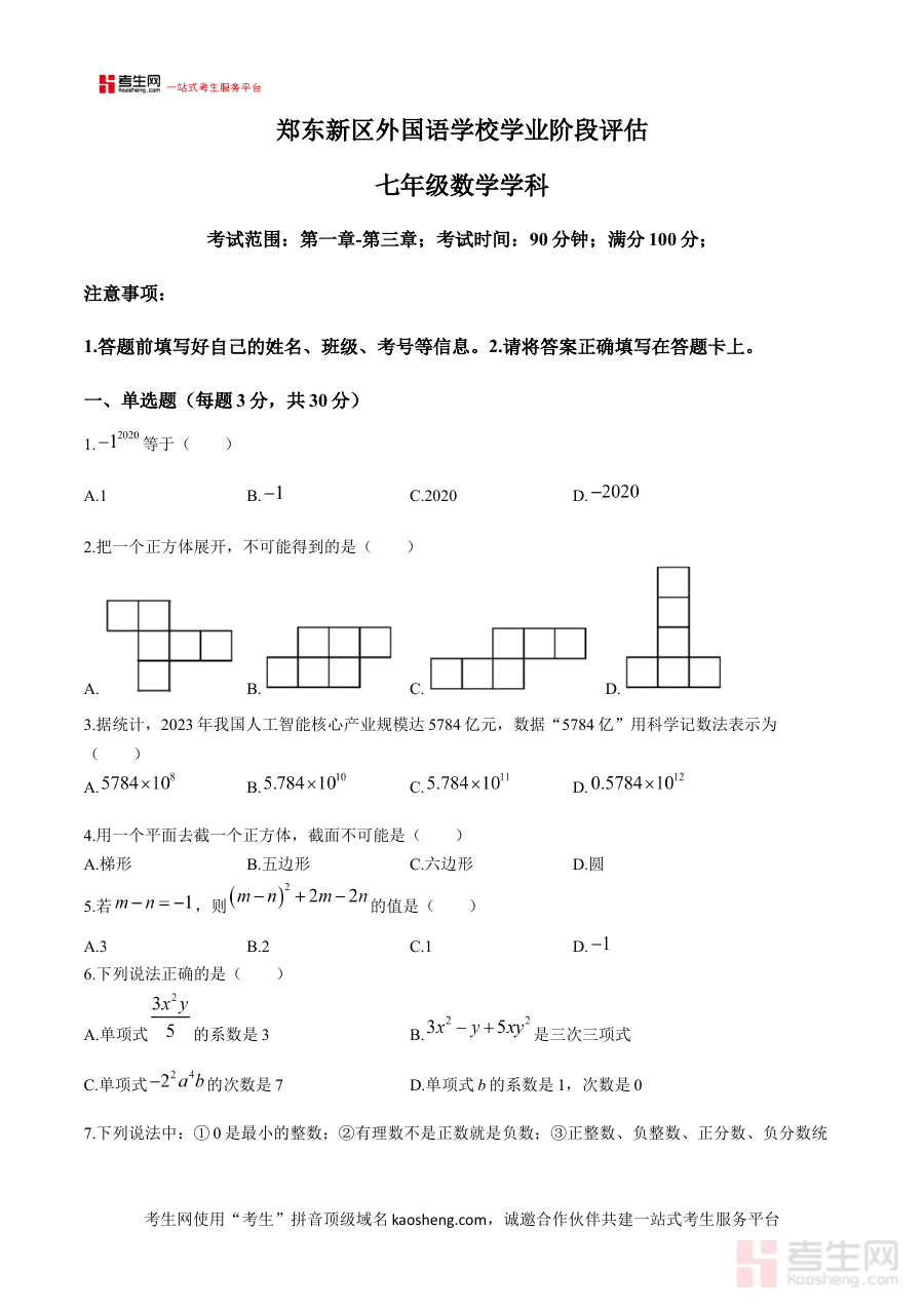 此试卷主要适用于河南省郑州市郑东新区外国语学校2024-2025学年上学期就读的七年级学生及负责该年级数学教学的教师;对学生而言,它是巩固半学期所学知识、提升应试能力的重要工具;对教师而言,则是评估教学效果、调整教学方案的有效参考,整体助力期中阶段教与学的高效推进与精准优化。