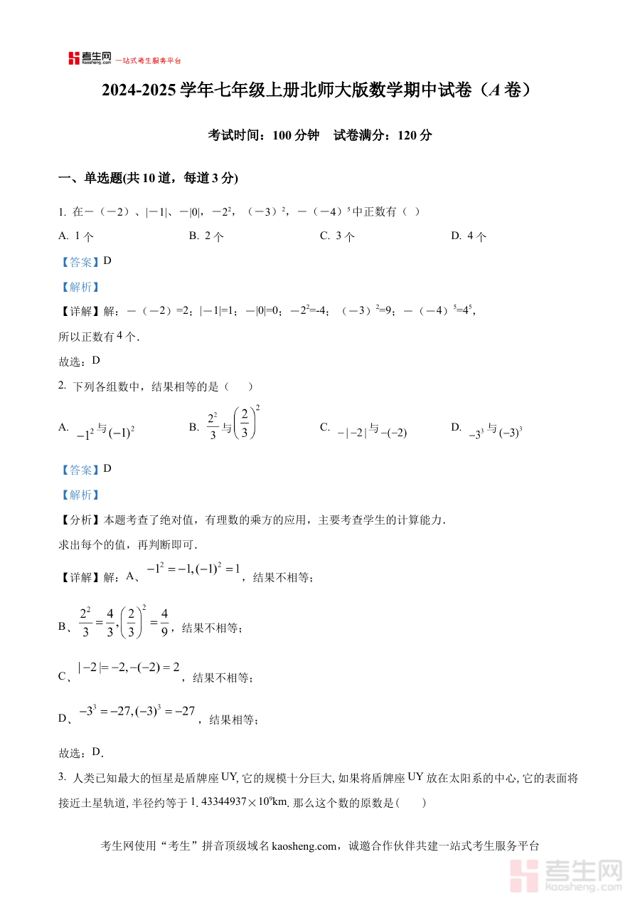 《精品解析:河南省郑州市2024--2025学年北师大版七年级上册数学期中试卷(A)(解析版)》是针对河南省郑州市2024至2025学年使用北师大版教材的七年级学生数学期中阶段考察的专业备考资料,它紧密贴合该地区该学年七年级上册数学学科的期中教学进度与本地考察要求,为相关学习者提供了与郑州本地期中测试高度匹配的精准备考支持资源。