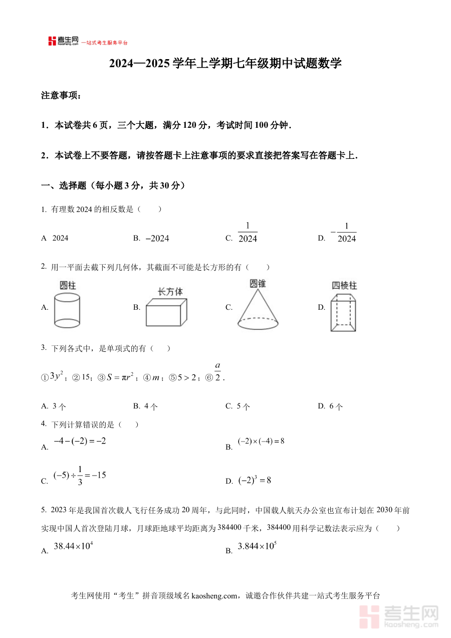 该资料作为原卷版试卷,主要用于七年级学生在期中阶段进行自我学情诊断,帮助学生清晰了解自身对本学期前半段数学知识的掌握程度;同时也为教师提供了区域联考的命题方向参考,助力教师优化后续教学与备考规划;此外,家长也可借助该资料了解孩子所在区域的数学学习评价标准,辅助孩子进行针对性的阶段检测与复习安排。