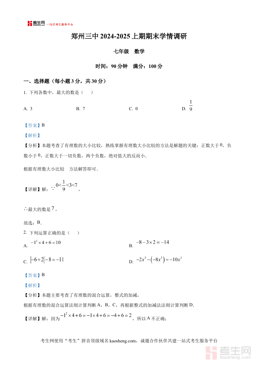 《精品解析:河南省郑州市第三中学2024-2025学年上学期期末调研考试七年级数学试题(解析版)》是针对河南省郑州市第三中学2024-2025学年上学期七年级数学期末调研考试的配套备考资料,明确对应特定学年、学期、地区学校及考试类型,为使用者提供与该考试直接相关的学习支持,帮助对接考试需求。