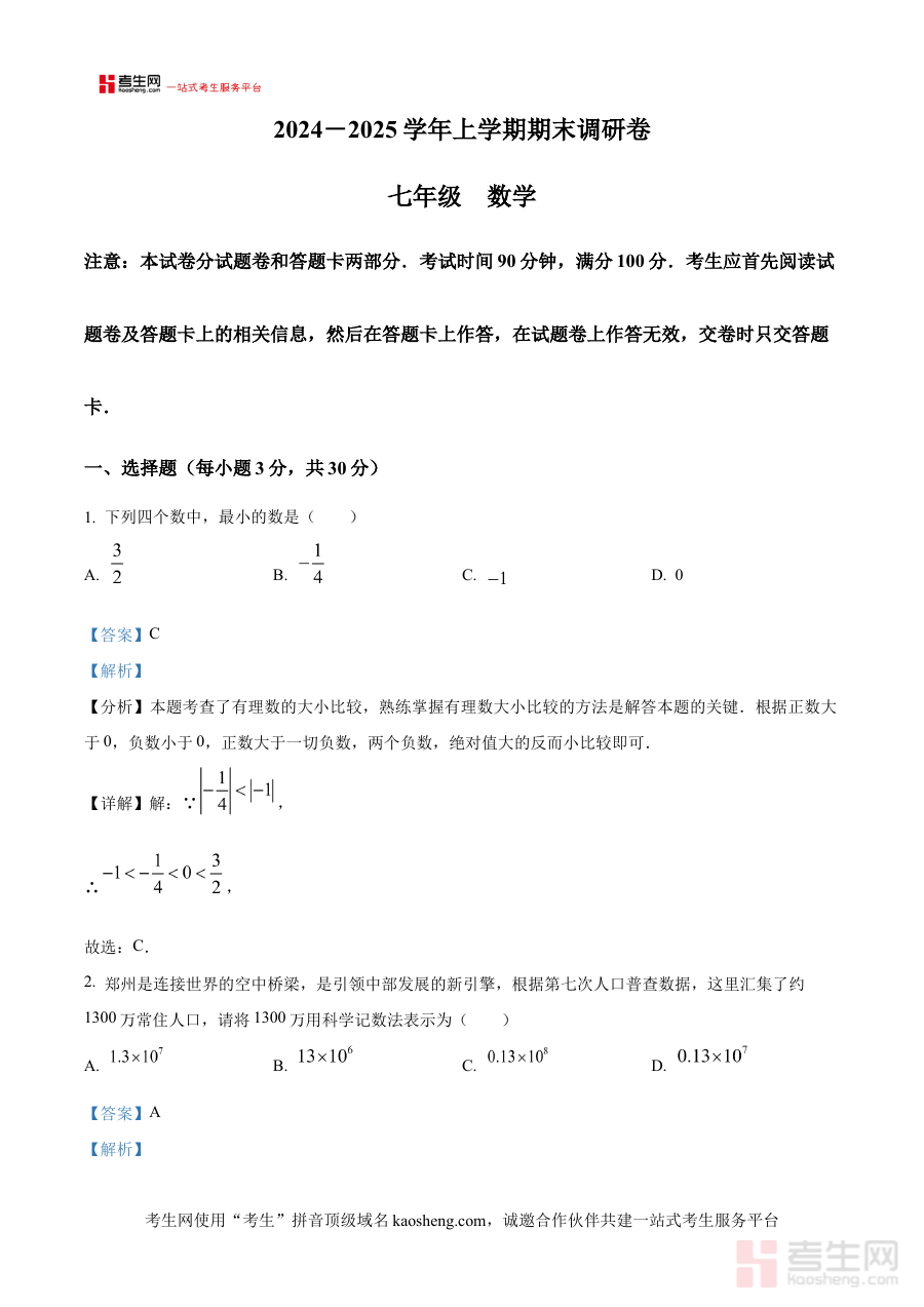 《精品解析:河南省郑州市航空港区2024-2025学年上学期七年级数学期末调研卷(解析版)》是针对河南省郑州市航空港区特定学年学期的七年级数学期末调研考试所打造的专业备考资料。它紧密贴合该地区该阶段的数学教学与考试实际情况,为使用者提供了与期末调研卷直接相关的解析内容支持,是适配该区域七年级学生期末备考需求的重要资源之一。