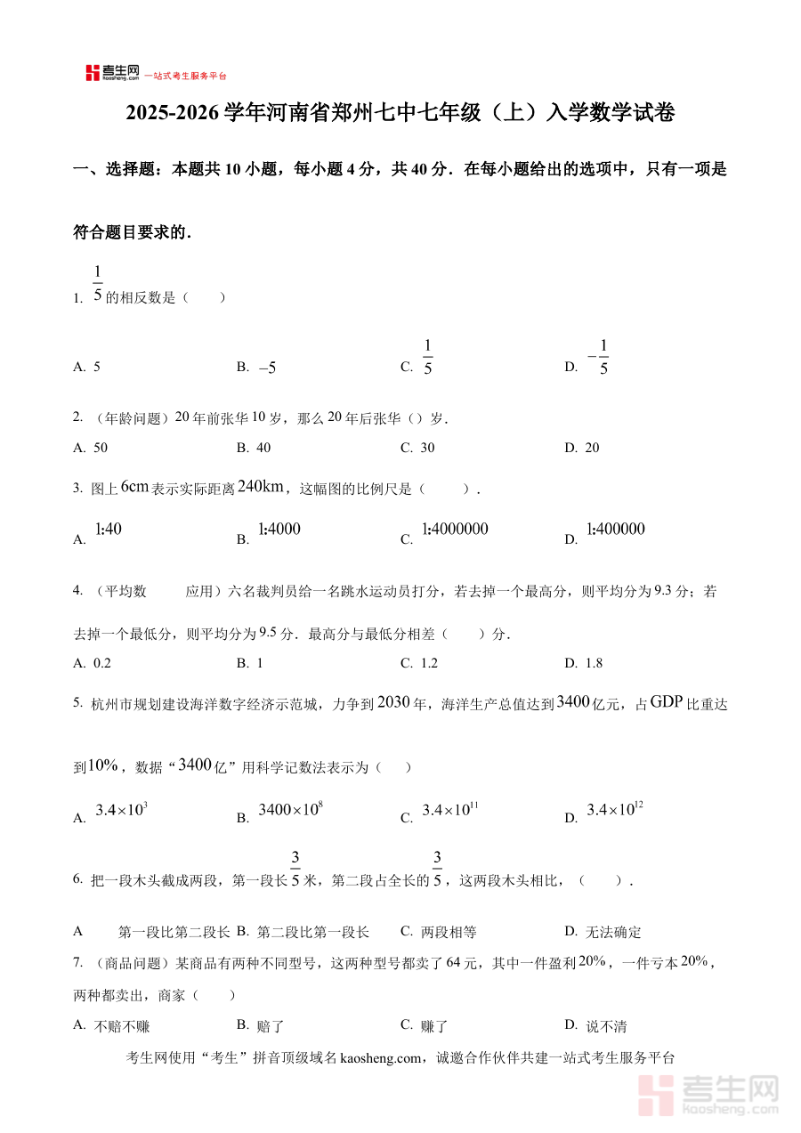 《精品解析:河南省郑州市第七初级中学2025-2026学年七年级上学期入学数学试卷 (原卷版)》是针对河南省郑州市第七初级中学2025-2026学年七年级新生入学数学考试的专项备考资料,聚焦该学校特定学年的入学检测场景,精准匹配七年级新生进入初中阶段的首次数学能力评估需求,为考生提供贴合目标学校命题特点的原卷内容参考,助力使用者快速对接该入学考试的核心考查方向。