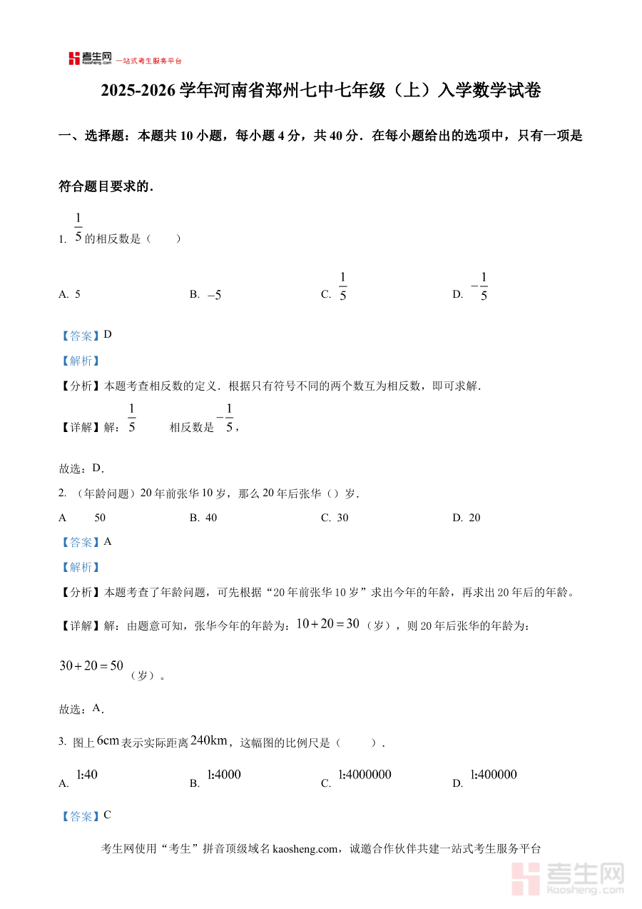 《精品解析:河南省郑州市第七初级中学2025-2026学年七年级上学期入学数学试卷(解析版)》是针对河南省郑州市第七初级中学2025-2026学年七年级新生入学阶段数学考试的专项备考资料,精准匹配该学校特定学年的入学检测场景,为相关使用者提供具有针对性的内容支撑。