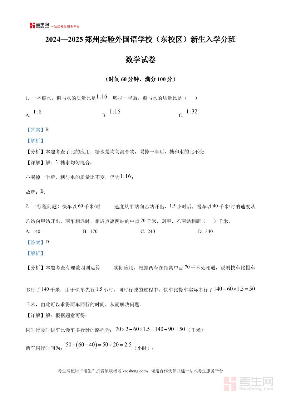 此资料适用于河南省郑州市二七区郑州实验外国语学校(东分)即将升入七年级的学生,以及需要针对性备考该校开学考的数学学习者,其解析内容能辅助学生完成阶段检测前的系统性准备,提升备考效率与针对性,为新学期数学学习搭建坚实基础。