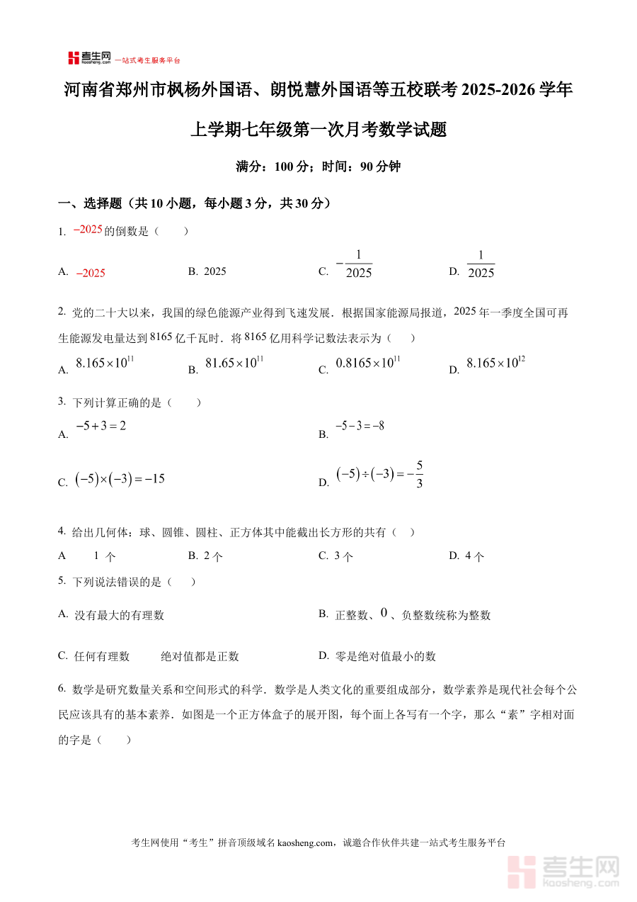 《精品解析:河南省郑州市枫杨外国语、朗悦慧外国语等五校联考2025-2026学年上学期七年级第一次月考数学试题(原卷版)》是针对河南省郑州市枫杨外国语、朗悦慧外国语等五所学校联合组织的2025-2026学年上学期七年级第一次月考数学科目的原卷资料,属于该次阶段性考试对应的核心备考材料,能够为使用者提供与考试直接相关的内容载体,帮助使用者快速对接考试实际场景。
