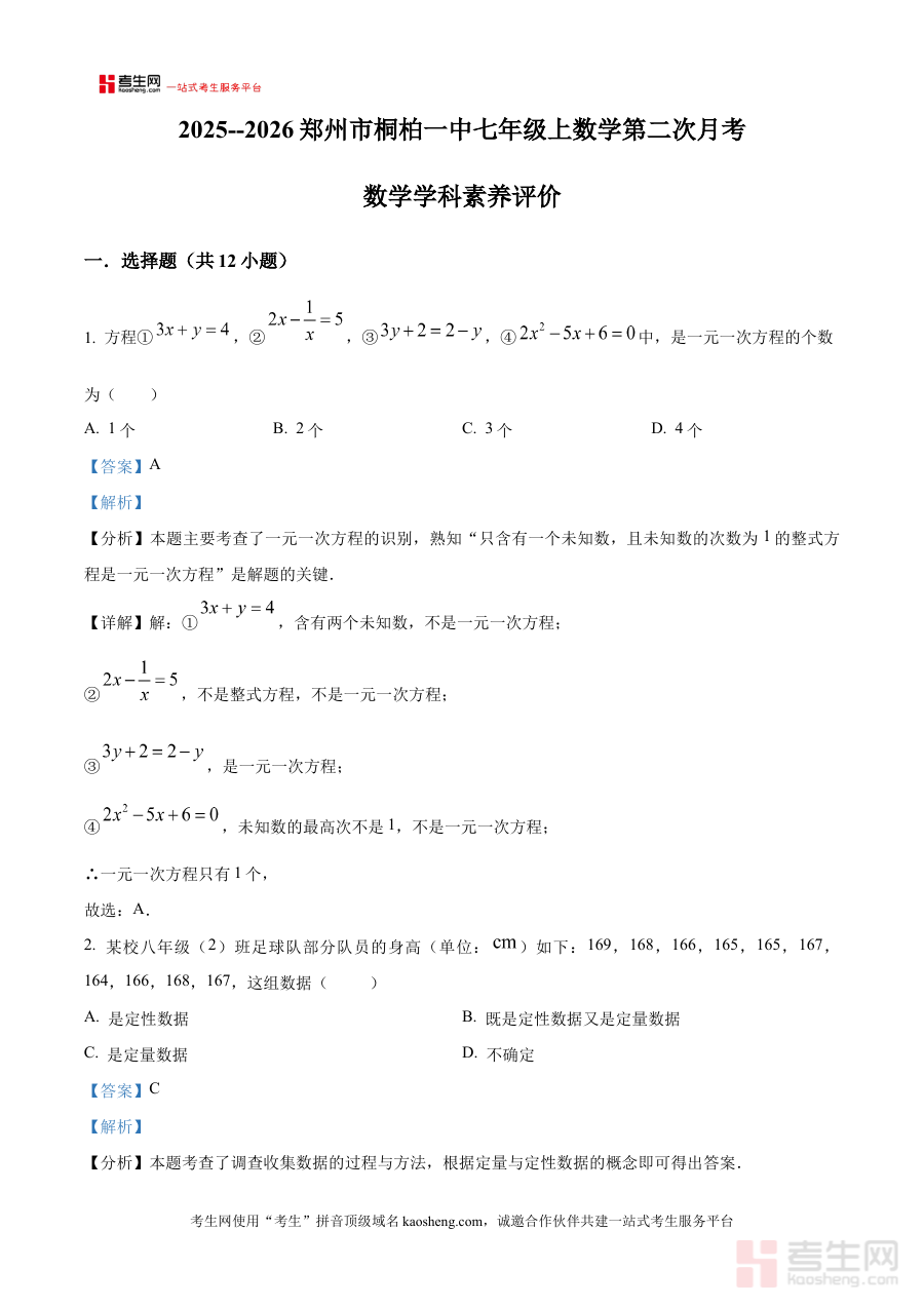 《精品解析:河南省郑州市桐柏一中教育集团2025-2026学年七年级上学期第二次月考数学试题(解析版)》是面向河南省郑州市桐柏一中教育集团2025-2026学年七年级学生的数学学科阶段性考试备考资料,精准对应该集团七年级上学期第二次月考的考查场景,为使用者提供具有针对性的试题解析服务。