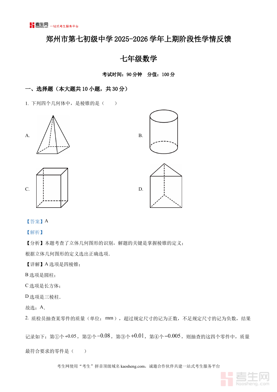 《精品解析:河南省郑州市第七初级中学2025-2026学年七年级上学期10月阶段性学情反馈数学试卷(解析版)》是针对河南省郑州市第七初级中学2025-2026学年七年级上学期10月阶段性学情反馈数学考试的专业备考资料,聚焦该阶段数学学科的学情检测核心需求,为相关使用者提供精准且系统的解析支持。