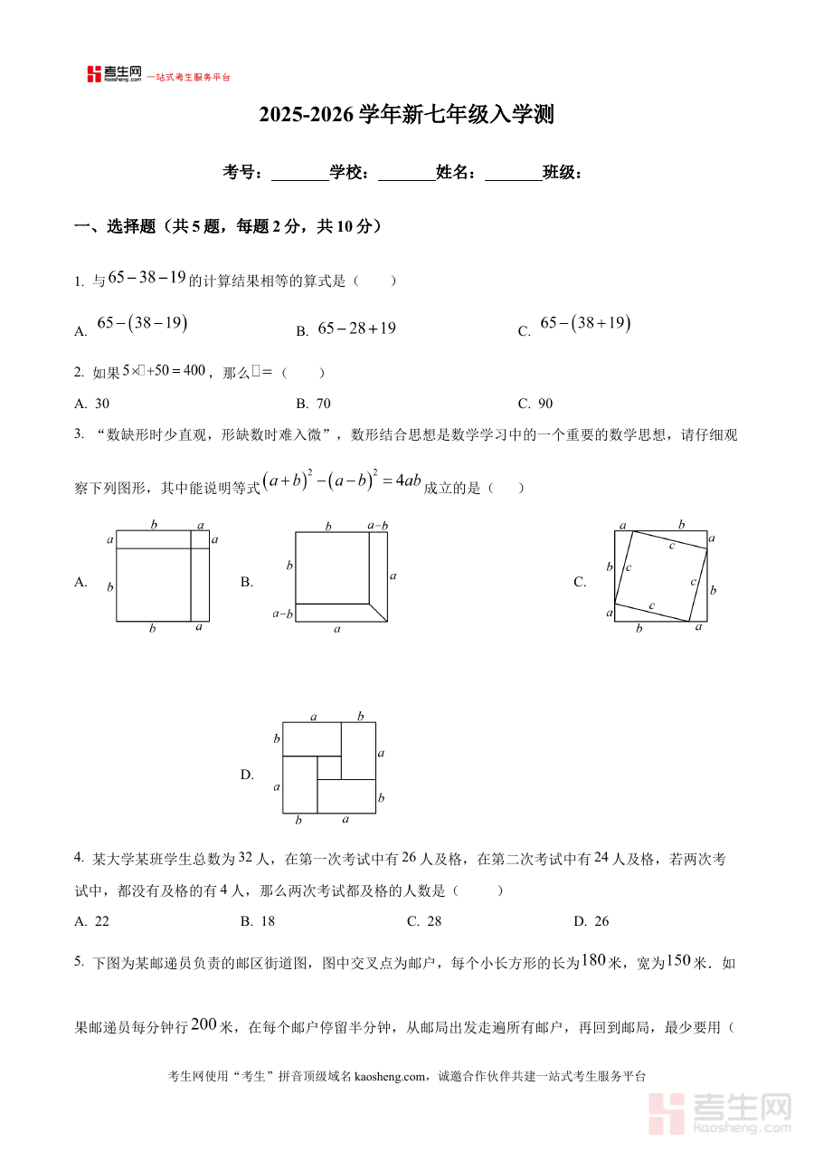 本资料适用于郑州市第八十二中学2025级七年级新生、家长及数学学科教师,通过原卷内容的呈现,助力新生快速适应入学测试的节奏,帮助家长有效配合学校做好入学准备工作,也为教师开展入学后的教学安排提供参考,具有较强的实践指导价值。