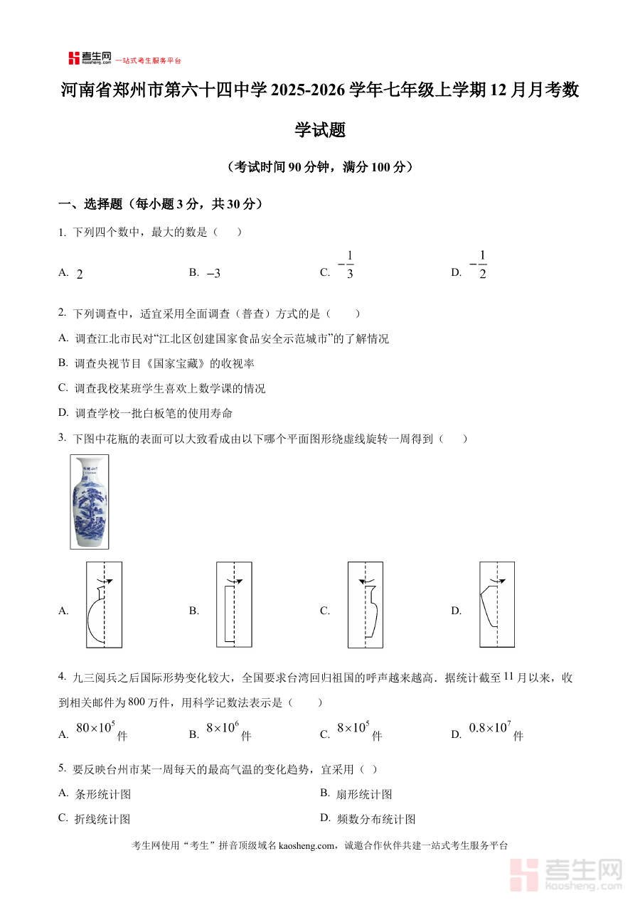 《精品解析:河南省郑州市第六十四中学2025-2026学年七年级上学期12月月考数学试题(原卷版)》是面向河南省郑州市第六十四中学2025至2026学年七年级学生的数学阶段性考试备考资料,对应该学年第一学期12月份的月度检测,能够为学生提供贴合本校教学进度与考查要求的练习资源。