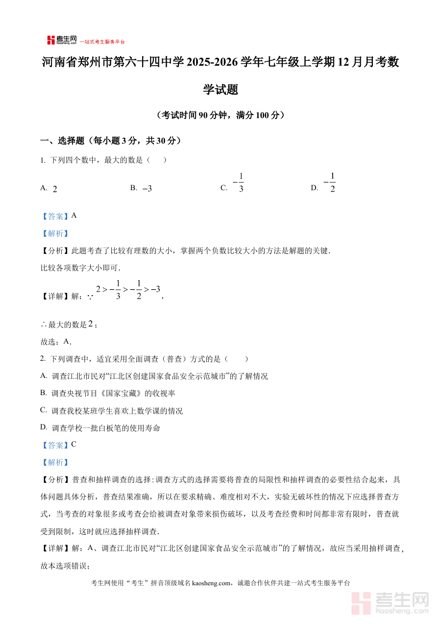 《精品解析:河南省郑州市第六十四中学2025-2026学年七年级上学期12月月考数学试题(解析版)》是针对河南省郑州市第六十四中学2025-2026学年七年级上学期12月数学月考的专业备考资料,聚焦该校该阶段内部阶段性考试需求,提供贴合本校教学进度与考试方向的解析支持。
